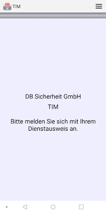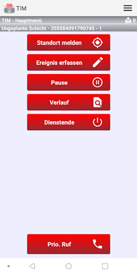 TiM is the mobile application for the control center deployment interface (LEO) for operative employees and subcontractors of DB Sicherheit. TiM documents the start of service, end of service and breaks, and records events. Location transfers are actively triggered by employees. The app has a Prioruffunktion, which establishes a direct connection to the control center.