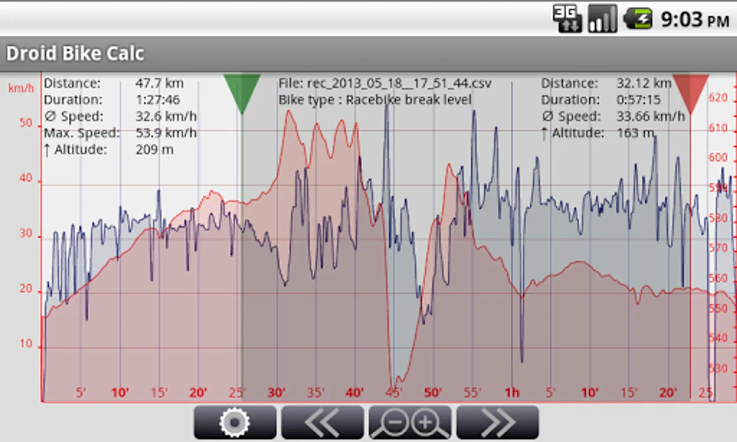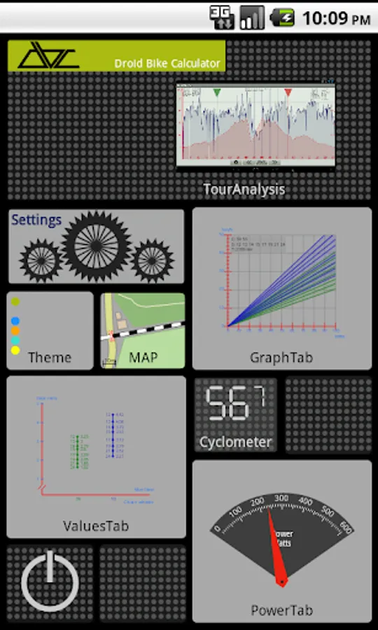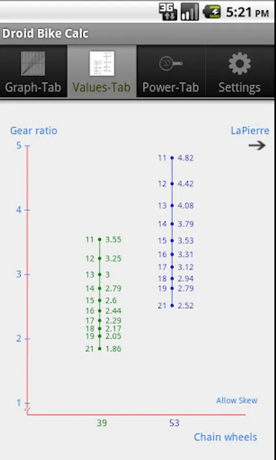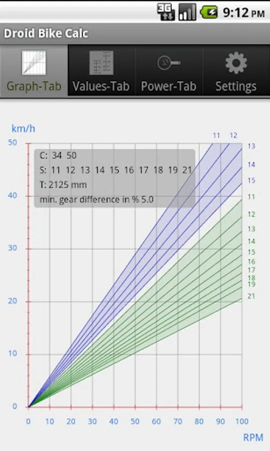 Droid Bike Calculator visualizes the interaction of gear, rpm and speed. You may set any user defined chainwheel and sprocket combinations. They will be displayed graphically and by values. In a further tab view you can determine Body-Mass-Index, slope, power values and energy consumption on a trip. In the Graph-Tab and the Values-Tab you may change the bitmap size by zooming. The actually visible bitmap may be saved as a jpeg file. In the Power-Tab you can wipe through the pages. Since version 1.4 it is possible to store settings within a profile management. You may be able to directly compare a "profile" and a "compared profile". Profiles can be exported or imported to/from filesystem.