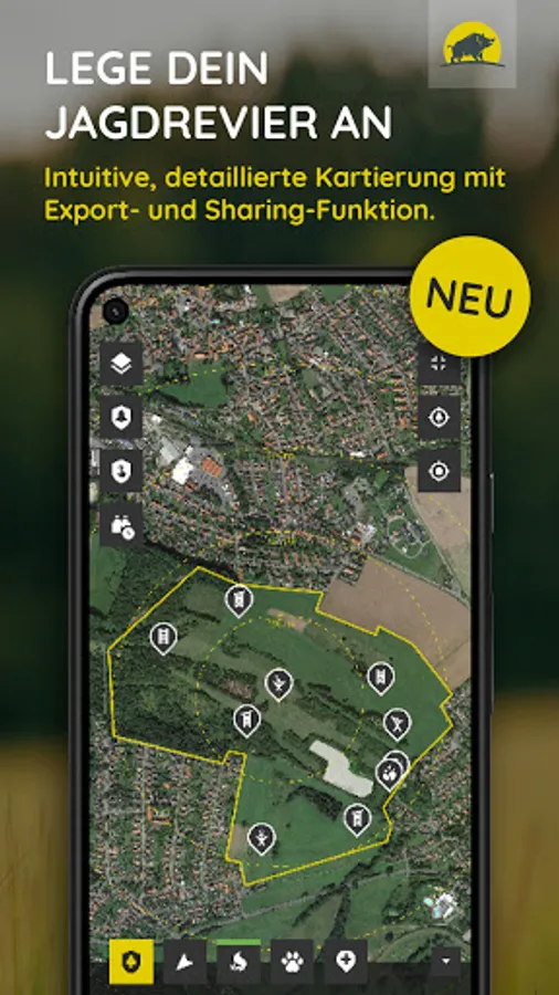 - a comprehensive area management for the representation of area boundaries and area facilities, for saving, exporting and sharing among fellow hunters