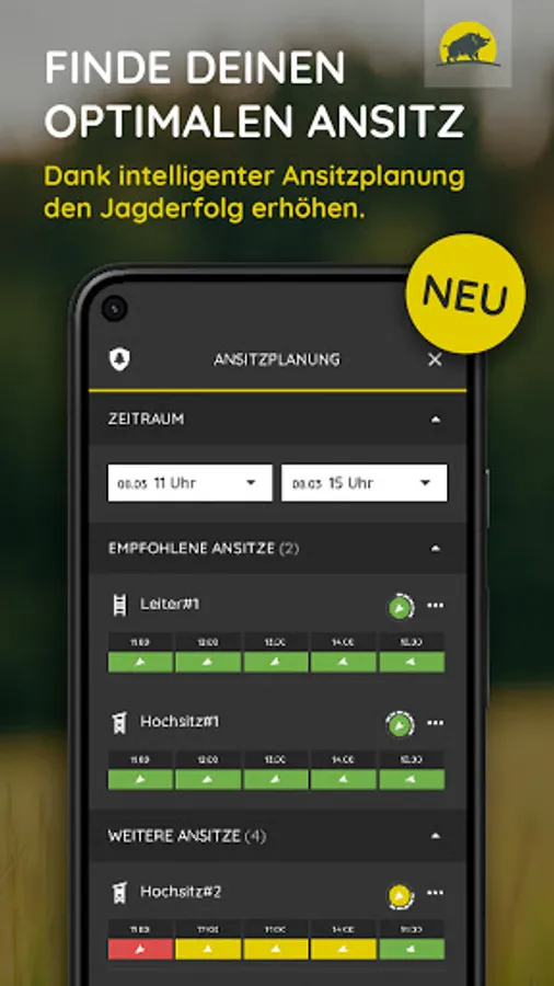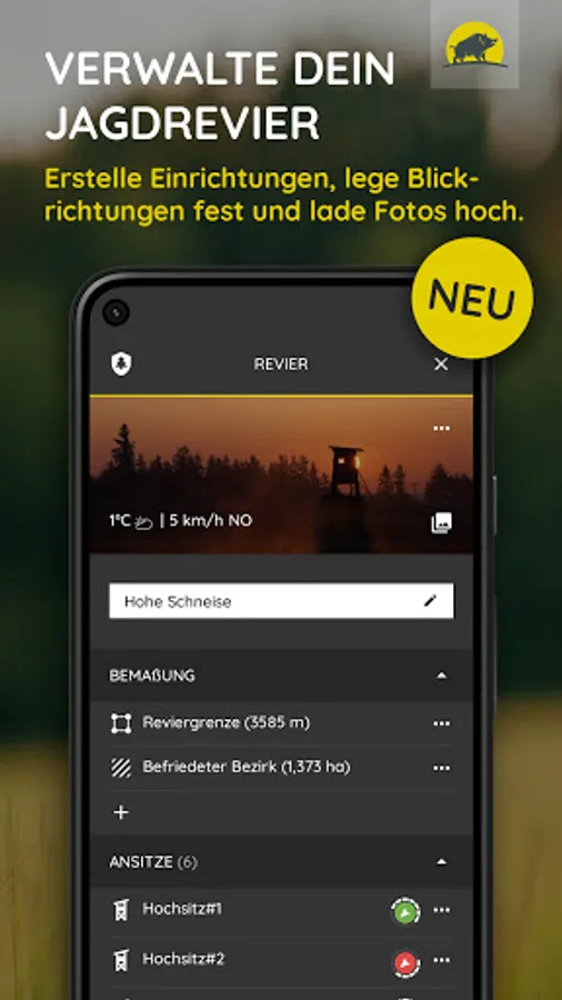 In the hunting weather app you will find weather and wind information for your area, as well as data on moon phases, moon brightness, as well as hunting times and closed seasons. From now on you can also create, manage and share your territorial boundaries and facilities on the territorial maps. Our intelligent hide planning also helps you to choose the best hide facility.