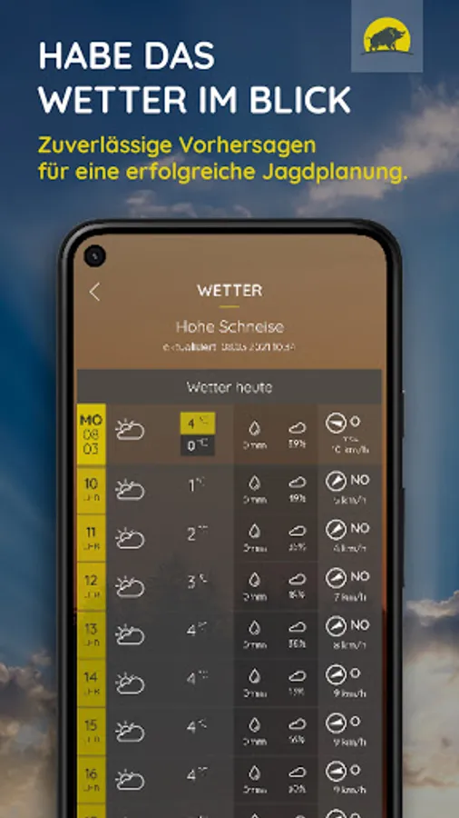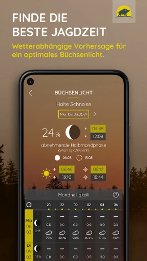 As a reliable hunting companion in pocket format, Jagdwetter provides you with all the important data for your hunting planning every day.