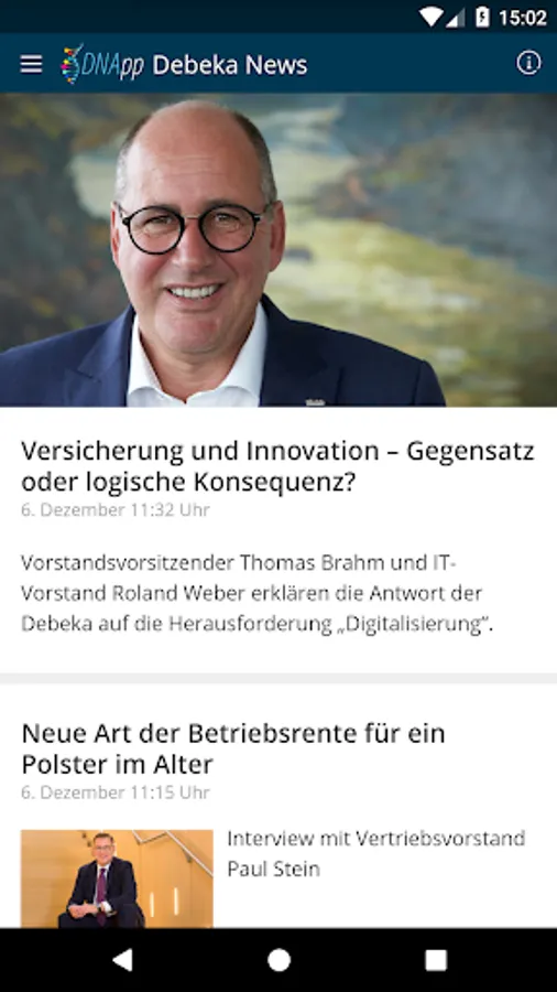 The Debeka DNApp provides fast and compact interesting news and information about the company. You will also find current press releases and contributions from various social networks directly on your smartphone.