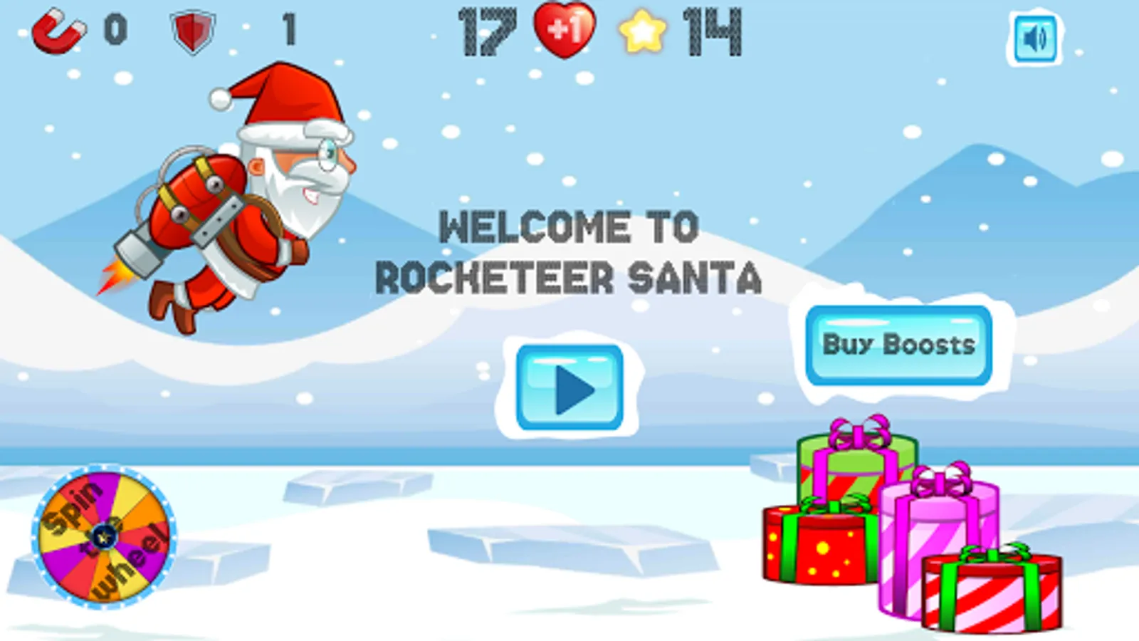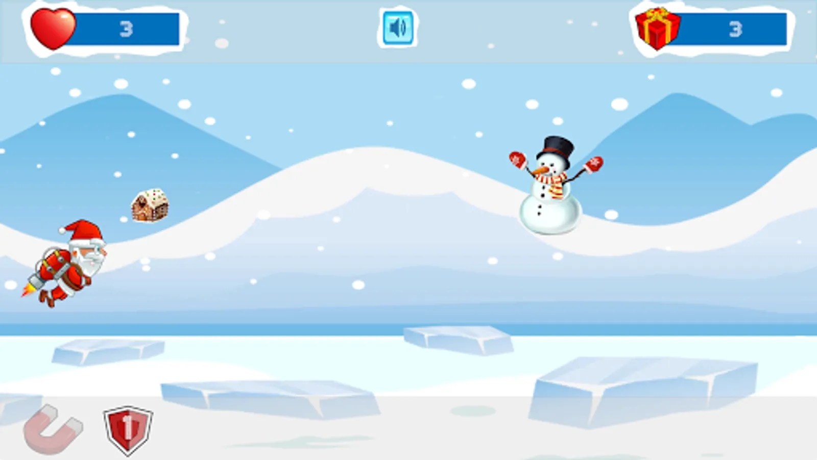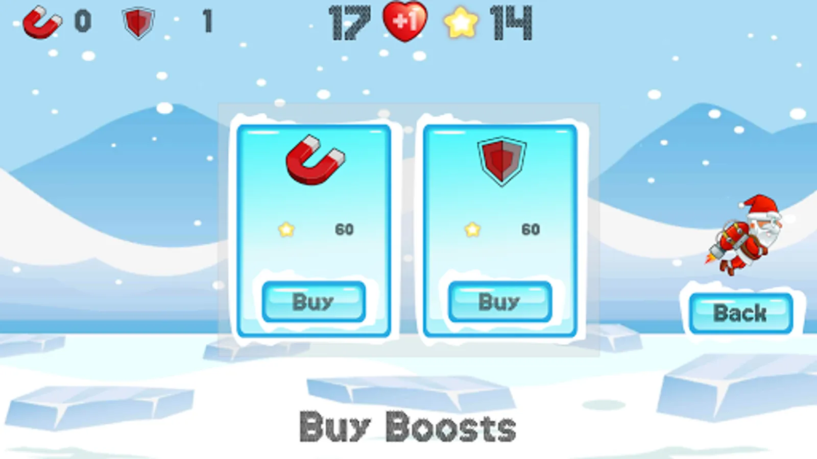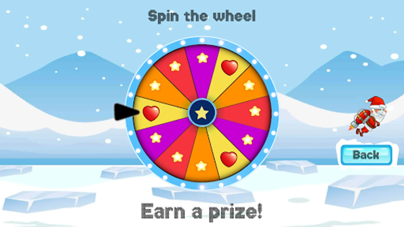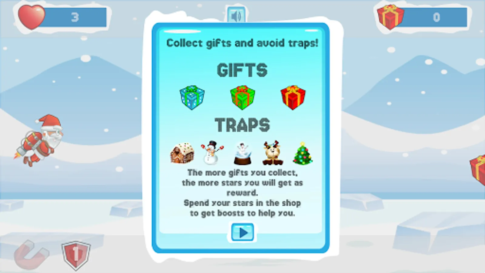 Christmas eve is near! But santa lost all the presents. Buckle up your jetback and let's go. Retrieve as much of the lost gifts as you can. But be aware: There are traps out there. But there is also help! You can spin the fortune wheel to earn extra lifes or get additional stars from it. With stars you can buy magnets or shields that help you.