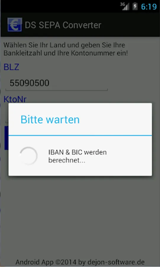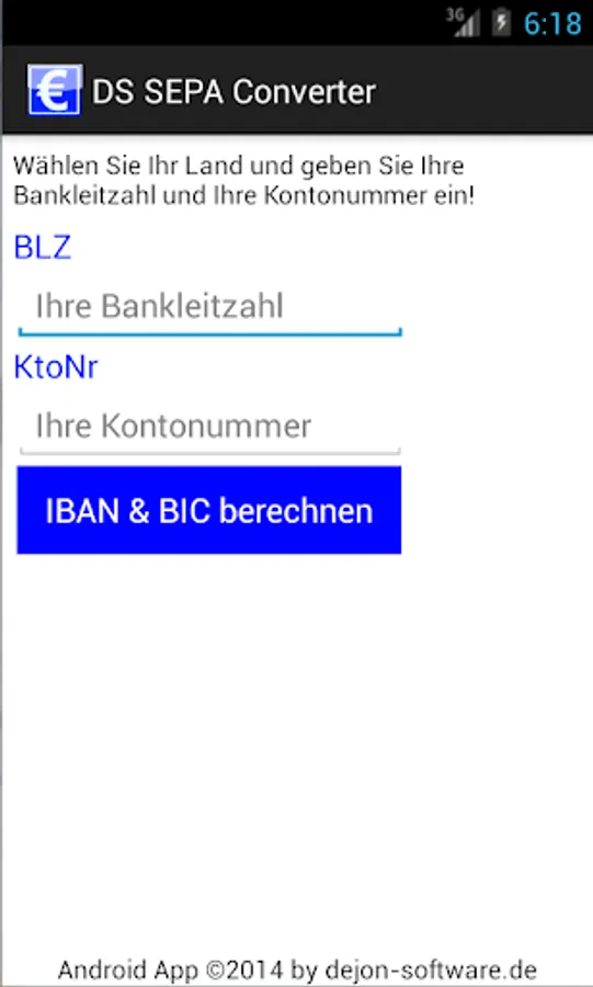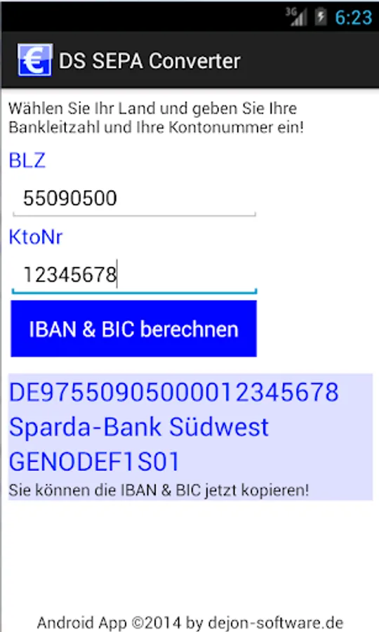 With the DS SEPA Converter, you can convert the conventional sort code and account number in IBAN and BIC. The app is at present still in beta version and the IBAN determined using the standard method - all accounts with special arrangements to check digit are not included in the beta version. In these cases, you may get the IBAN and BIC at your bank. The app requires no special permissions like network access GPS, etc., all calculations are performed locally.