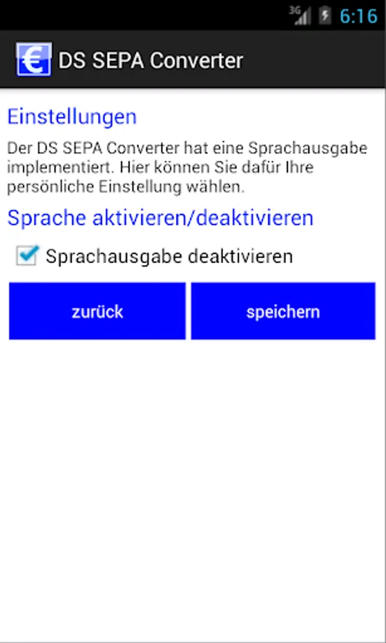 The DS SEPA Converter has implemented a voice output. You may at any time off or a in the Settings menu.