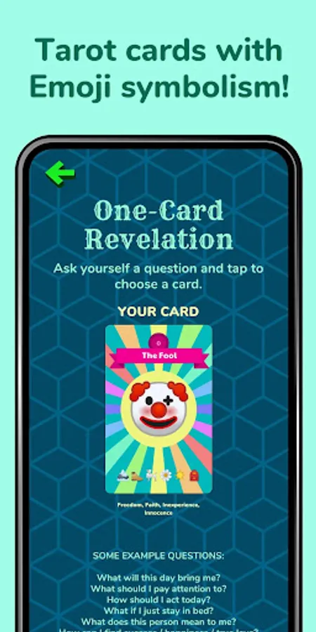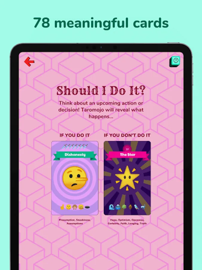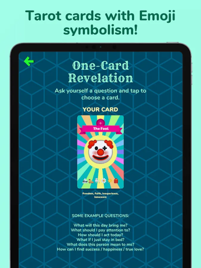 This app features Tarot cards with clear and direct Emoji symbolism. This new take on Tarot cards allows you to quickly understand the card meanings, which makes it perfect for beginners. Bright colours add a light-hearted tone to their existential themes. Each card features additional Emojis at the bottom that unfold the broad symbolism of the classic Rider Waite Tarot cards.