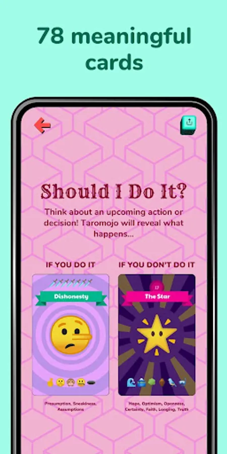 The app is also perfect for a shared experience. Tarot sessions with your friends will inspire deep and personal conversations. Learn new things about each other and exchange your thoughts and feelings.