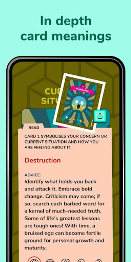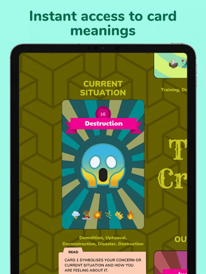 Picking a card is a delightful experience. You can almost feel the 78 life sized cards right under your finger tip as you choose the exact card you want to pick with ease. Fluid 3D animations lead to a dramatic reveal of your chosen card.