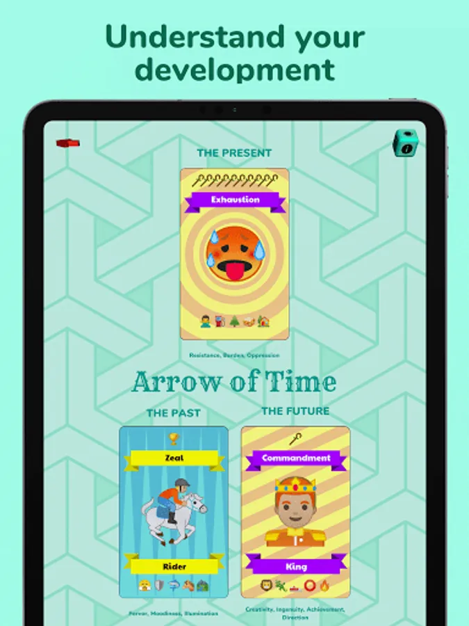 In the readings you can quickly zoom in and out of your cards to reflect on their meanings. Instant keywords will guide your own interpretation of the card’s meaning. For a deeper understanding you can easily access detailed card explanations for personal development, partnership analysis, work advice and more.