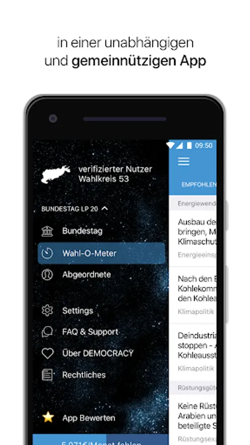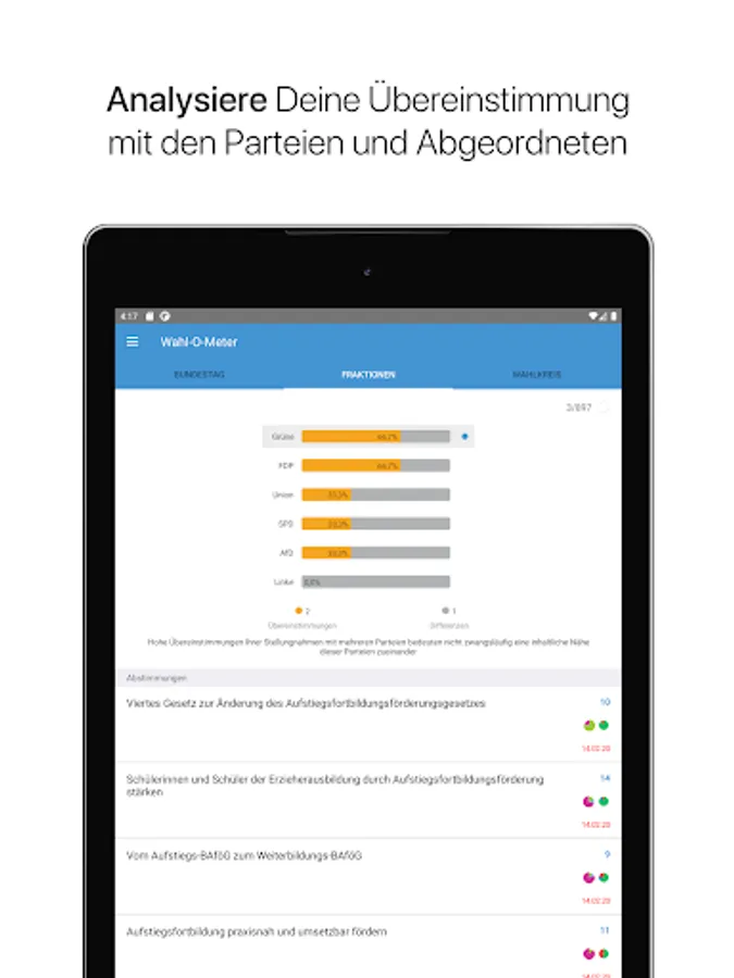 The Wahl-O-METER is a function of the DEMOCRACY app. Right from the start, he compares all your voting results with those of the parties and checks how much you agree with their political actions: Which parties and members of parliament are close to you and for the same issues that are important to you? It's about political action, not words and promises. The more often you vote, the more accurate the result of your choice o-meter will be.