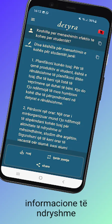 Welcome to homework, the mobile app that helps students, learners and everyone who is passionate about homework and other questions using artificial intelligence (OpenAI). Available on the Google Play Store and the App Store, "task" was founded in March 2023 as a start-up in Germany. Our goal is to adapt education in the Albanian-speaking area to the age of AI.