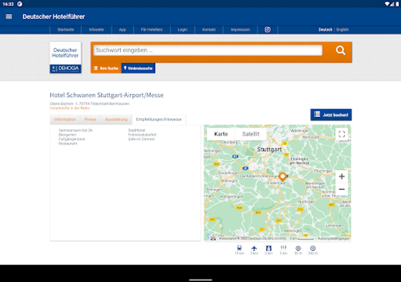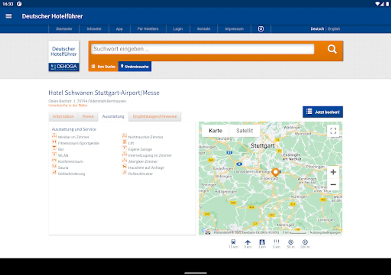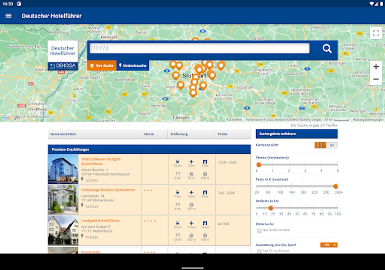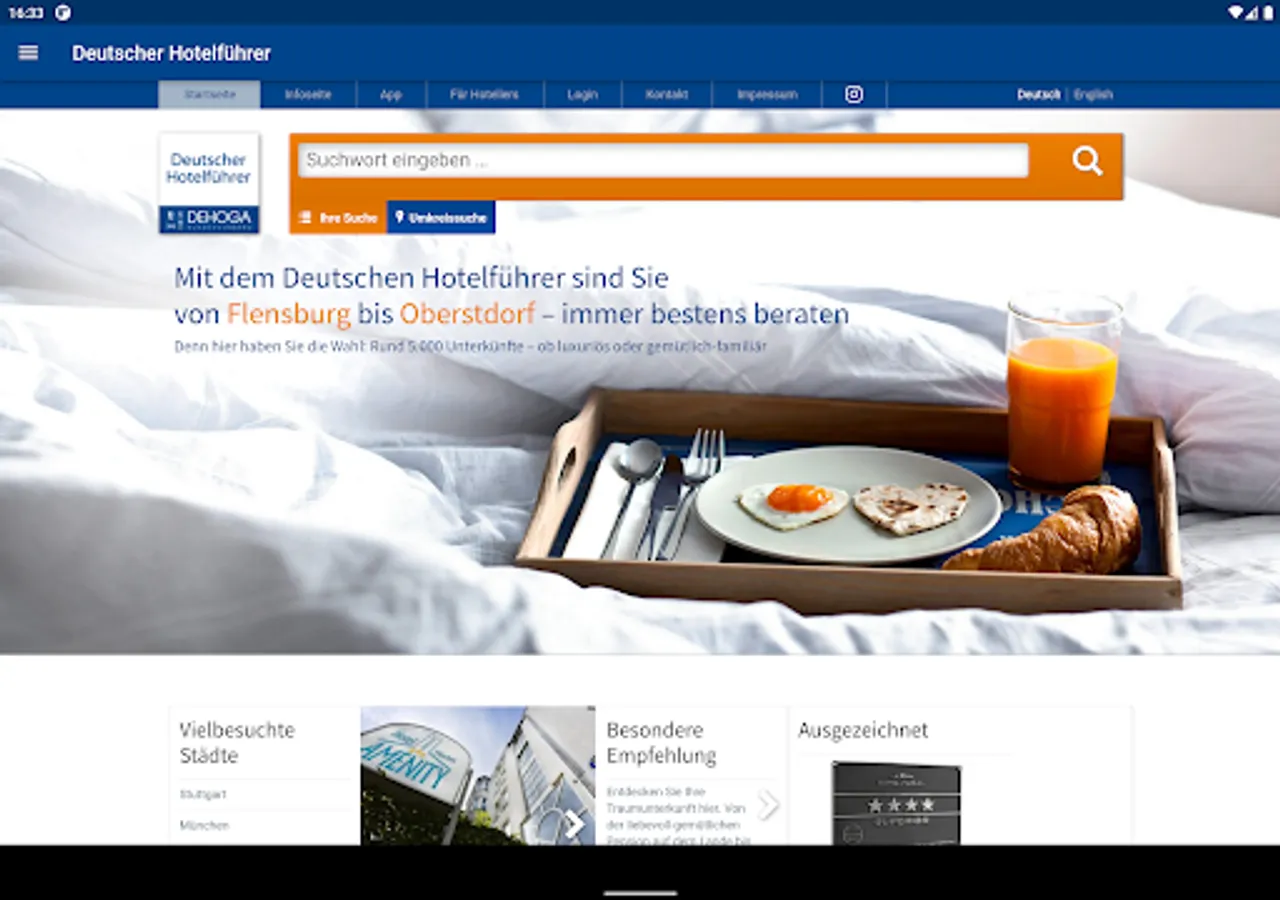 Whether wellness offers, city breaks, luxury suites or guesthouses - in the German hotel guide of DEHOGA (German Hotel and Restaurant Association e.V.) you will find a wide range of accommodations in different price categories. The German hotel guide presents its users with an offer from several thousand accommodation establishments. Including many cheap offers, such as hotel garnis or inns.