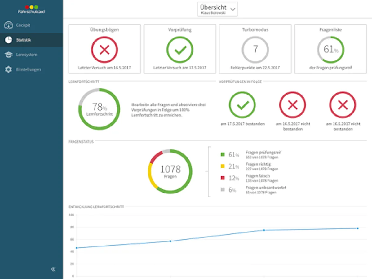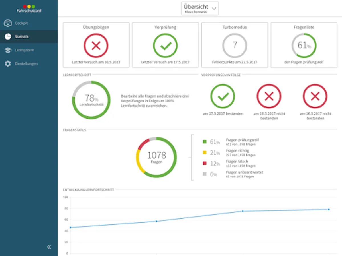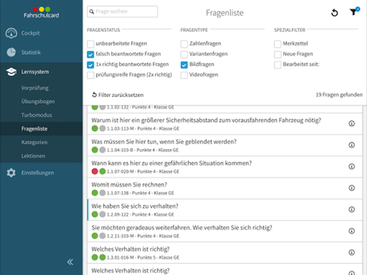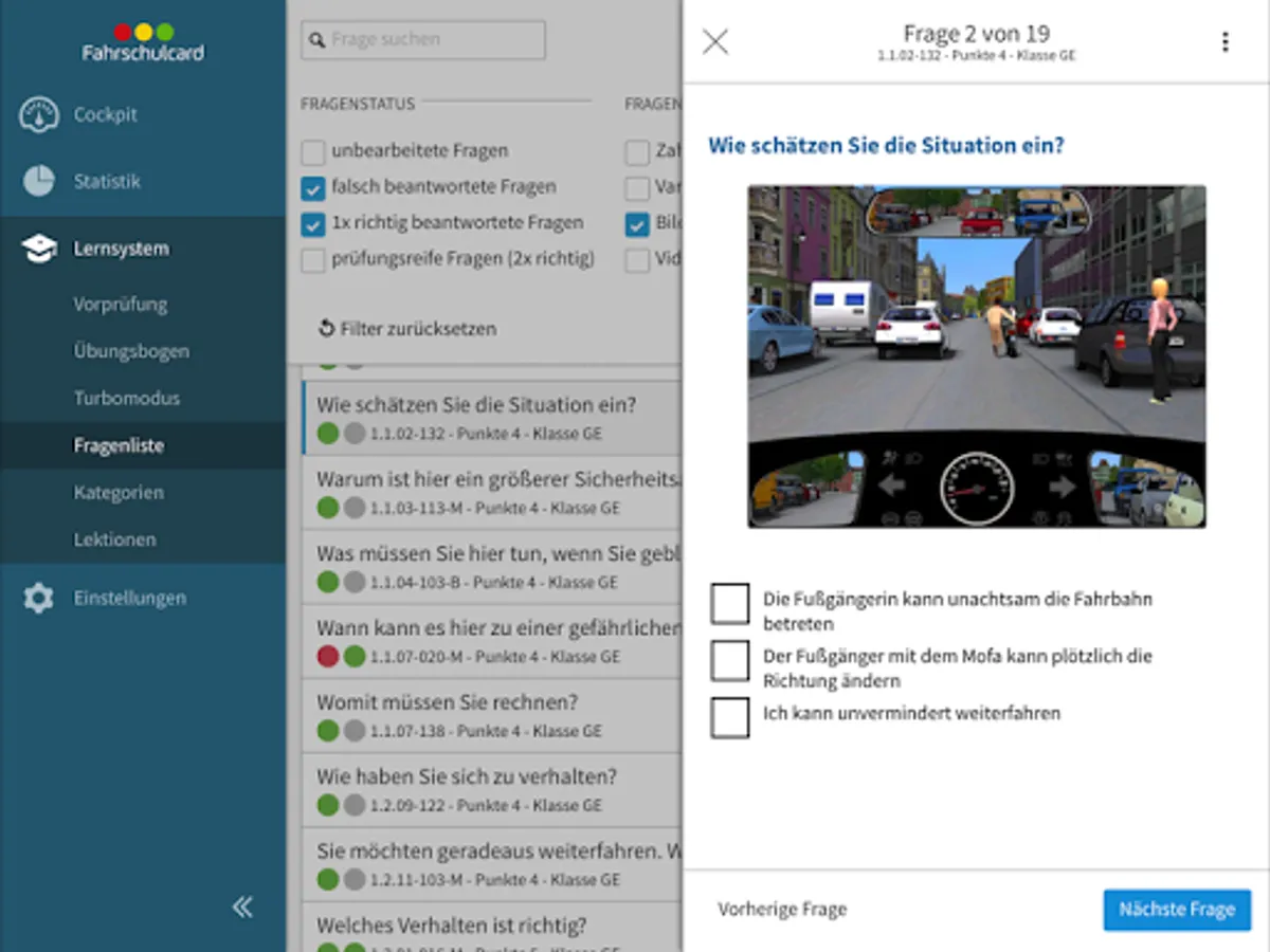 Sync: Your learning progress will be synchronized with the cloud. Whether PC or mobile device, users of the online learning system fahrschulcard.de (available in driving school) always learn on your current status.