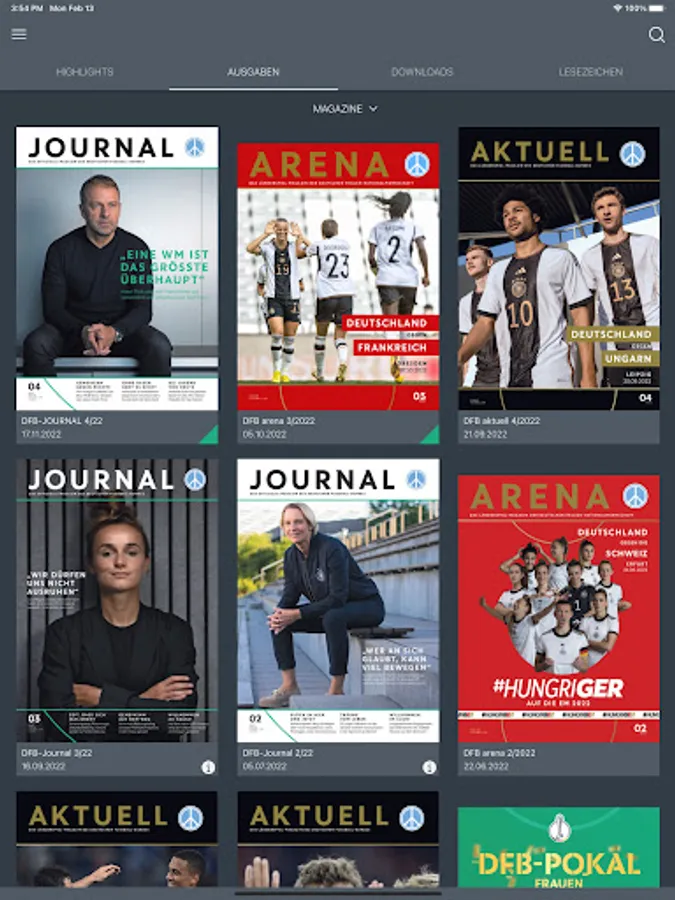 Welcome to the magazine app of the German Football Association. It is the online platform for the publications of the DFB and offers comprehensive and free access to the magazines "DFB-Journal", "DFB-Aktuell", "DFB-Arena" and "DFB-Pokal". All football in one app – for smartphones and tablets, also available for download on request.
