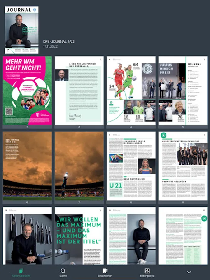 You can also read the current stadium magazines for every home game of the women's and men's national teams and for the DFB Cup finals. So the game doesn't just start with the kick-off. And not only for the spectators in the stands, but also on the couch, on the train, in the pub, no matter where. Here you will find everything you need to know about the teams, the squads, special stories and number games, interviews and historical texts. For fans and those who want to become one. And here, too, with diverse multimedia content. The truth is on the pitch - and you can find everything you need to know about it in the DFB magazine app.