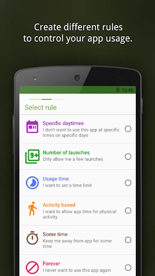 Every time you violate one of your own rules, AppDetox will remind you to take a break and stop your heavy app usage. You can also keep track of these violations in a log. Some people are using AppDetox for parental control of their kid's screen time.