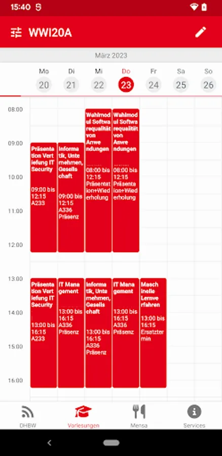 After selection of your course you will gain access to the online timetable with upcoming lectures incl. Indication of the name of the lecturers, time and place.