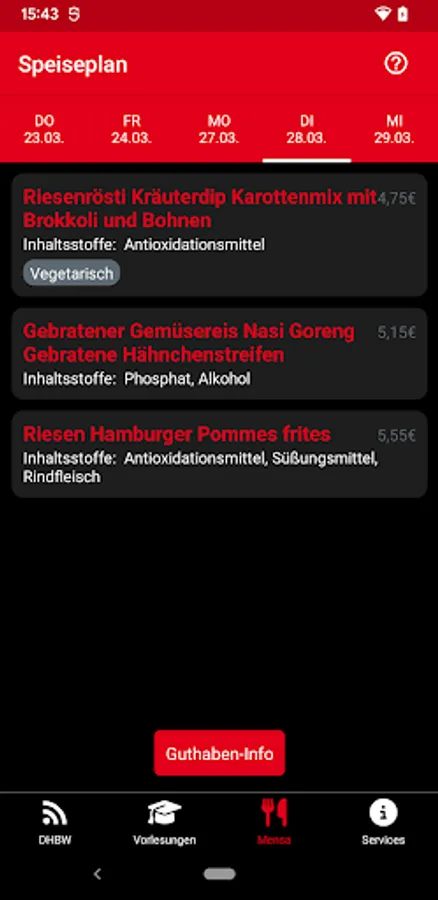 Here you see the menu for the next day. Depending on which role you select, you can see the corresponding prices. In addition, a list of additives is deposited with each meal. If the smartphone NFC support, you can read the current products on the DHBW card balances.
