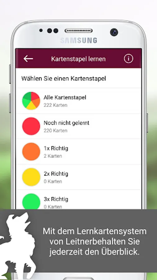 The functionality of the flashcards app is based on Leitner's proven learning system, which sorts questions into one of five subjects depending on the learning progress. Trained questions are sorted one tray at a time until all questions have been successfully learned. In addition to the learning function, there is also the possibility to create an individual learning program with content and fixed learning times and to check the learning success with the aid of detailed statistics.