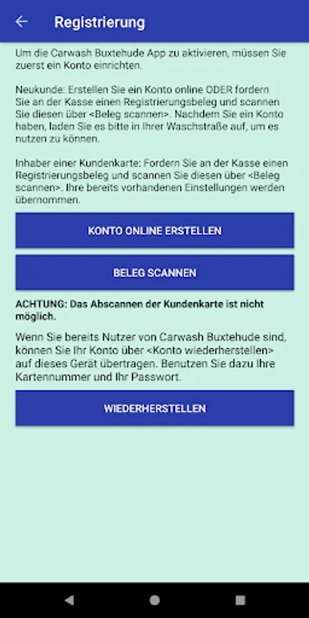 Um die App als Kundenkarte freizuschalten, melden Sie sich an unserer Kasse und scannen Sie einmal einen Beleg (NICHT Ihre bisherige Plastikkarte, sofern Sie bereits über eine Karte verfügen). Und sofort können Sie Ihre Karte nutzen. Wenn Sie bereits Besitzer einer Buxtehude Carwash Kundenkarte sind, dann bringen Sie sie mit und wir übernehmen das Guthaben direkt.