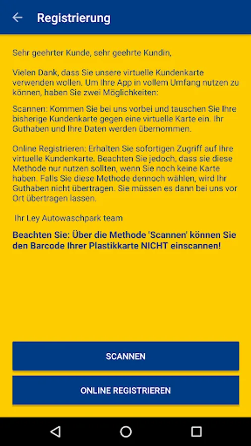 To unlock the app as a loyalty card, sign up for our checkout and scan once a document (NOT your current plastic card, unless you already have a card). And now you can use your card. If you already own a washing Ley map, then bring it along and we take the credit directly.