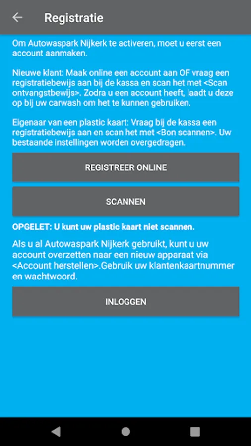 To activate the app as a loyalty card, log in to our cash register and scan a receipt once. (NOT your plastic card if you already have it). And you can immediately use the card. If you already have a Car Wash Park Nijkerk customer card, take it with us and we will take it with you. the honor to take over immediately.