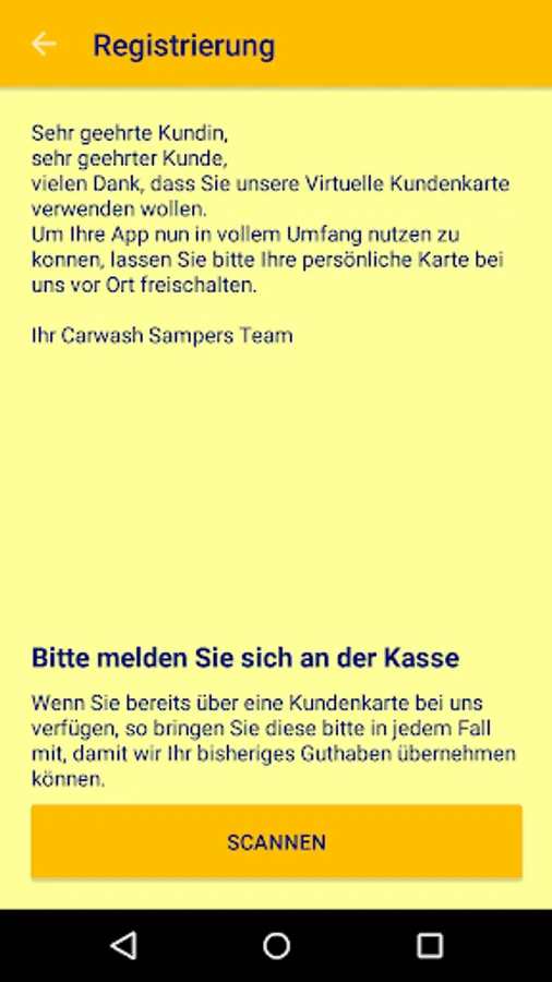 To unlock the app as a loyalty card, sign up for our checkout and scan once a document (NOT your current plastic card, unless you already have a card). And now you can use your card. If you own a carwash Samper Already customer card, then bring it along and we take the credit directly.