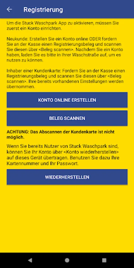 To unlock the app as a customer card, log in at our checkout and scan a receipt (NOT your previous plastic card, if you already have a card). And immediately you can use your card. If you already own a Stuck Waschpark customer card, bring it with you and we will take over the credit directly.
