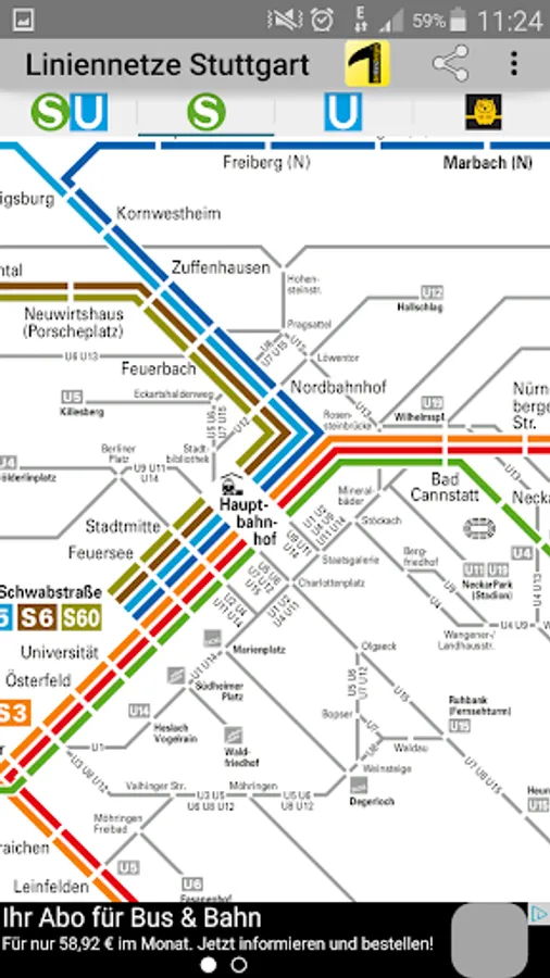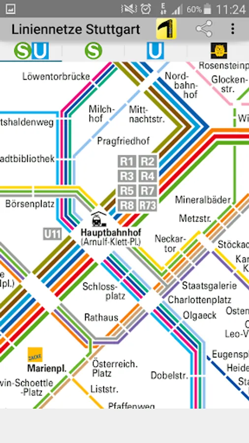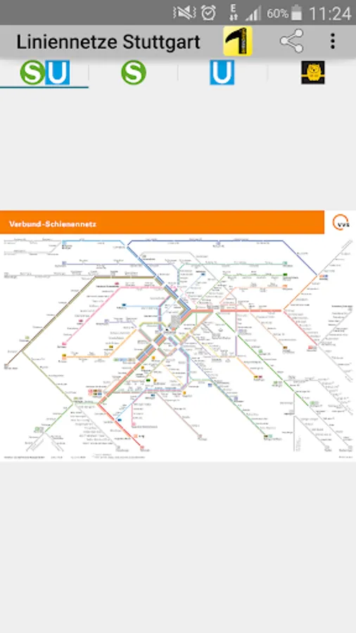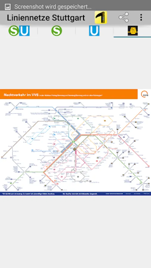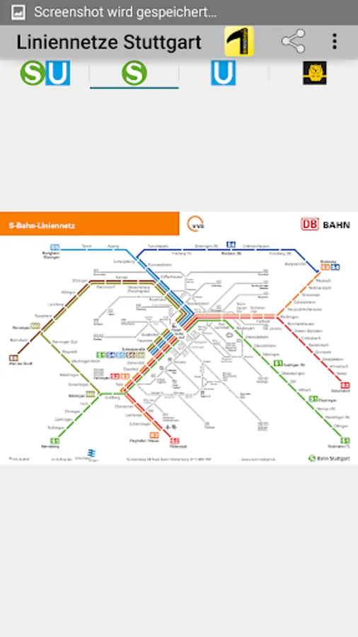 All network maps are suitable for local public transport (LPT) in the Stuttgart tariff area. The app includes the route network for S-Bahn, U-Bahn, R-Bahn, Stadtbahn, bus, cable car and night bus.