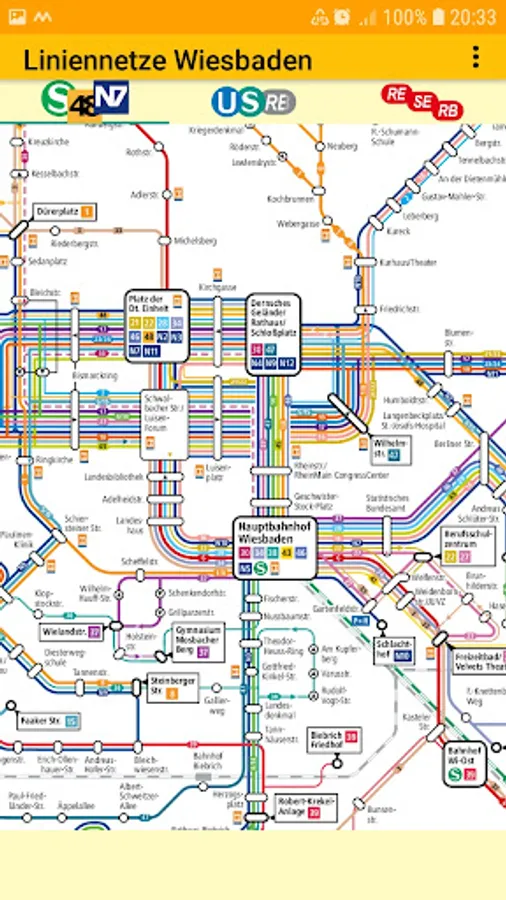 All network maps are suitable for local public transport (LPT) in the Wiesbaden tariff area. The app includes the route network for S-Bahn, streetcar and bus.