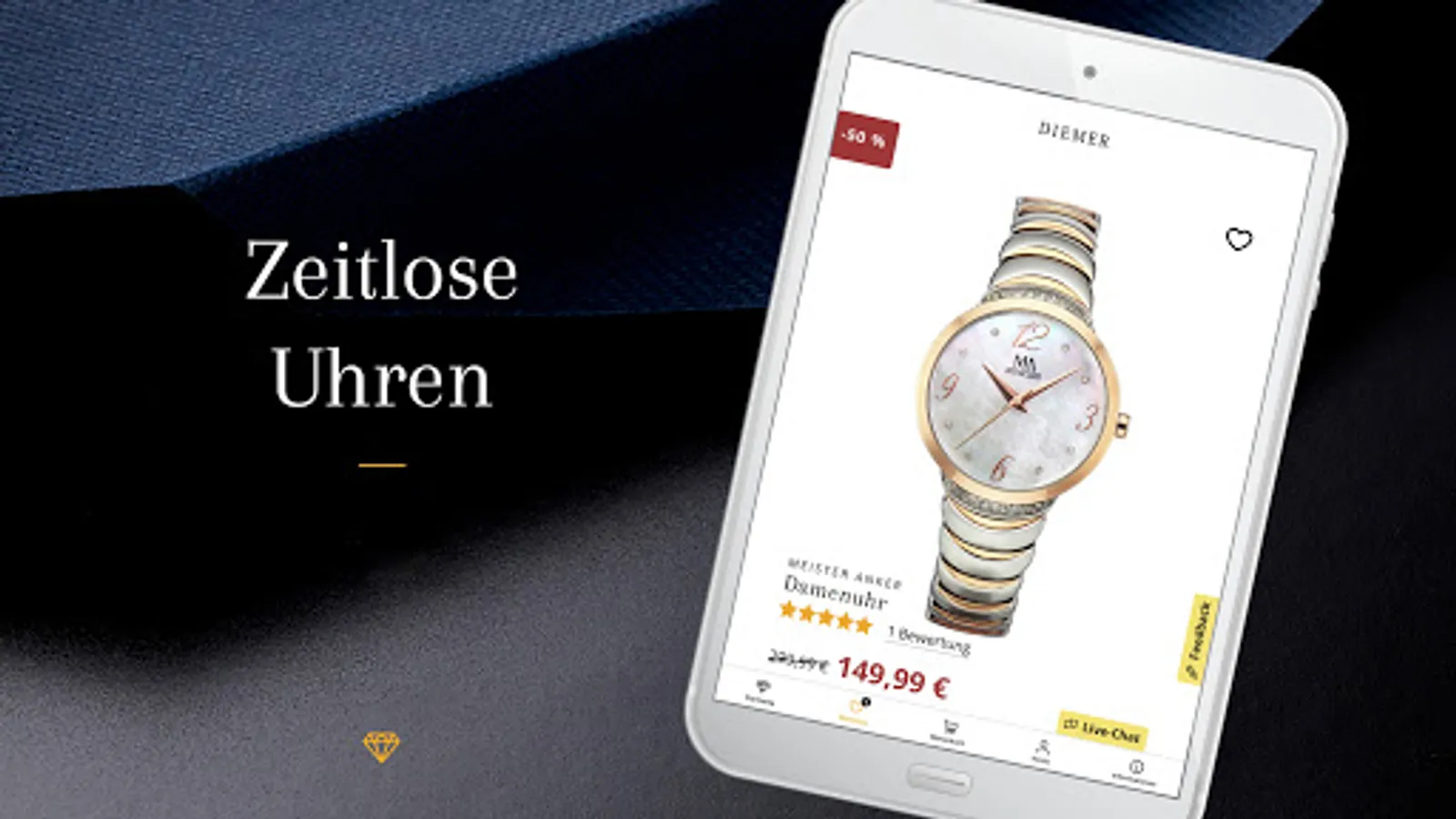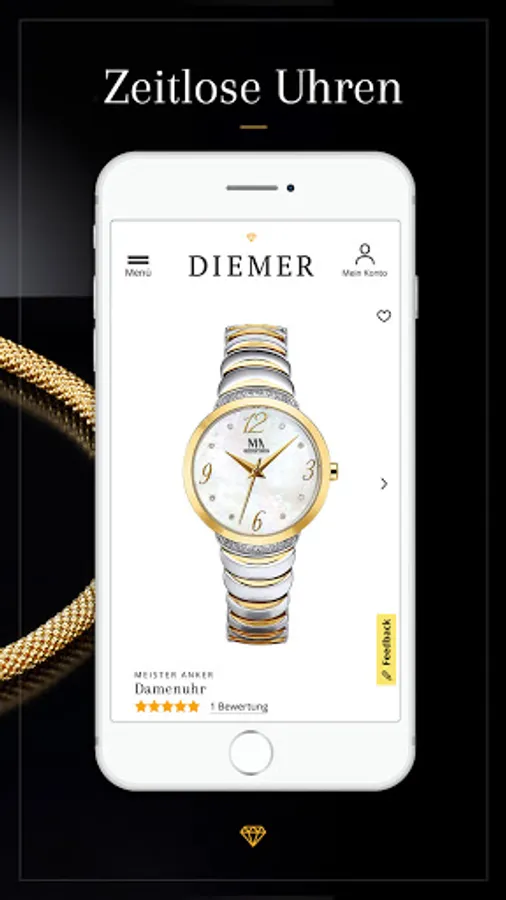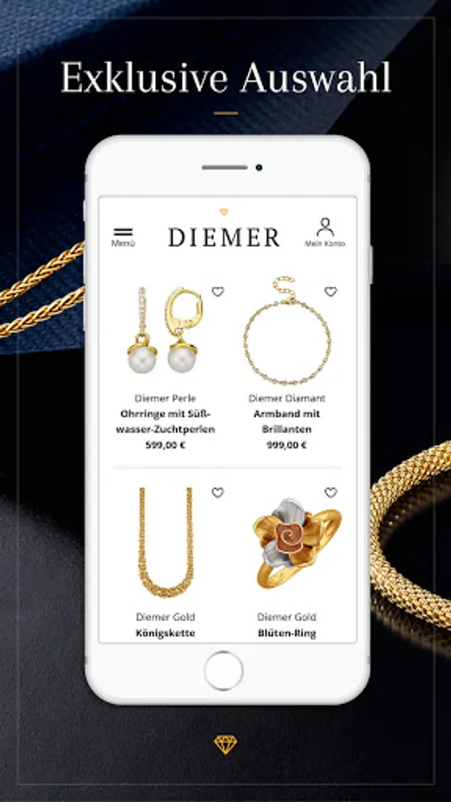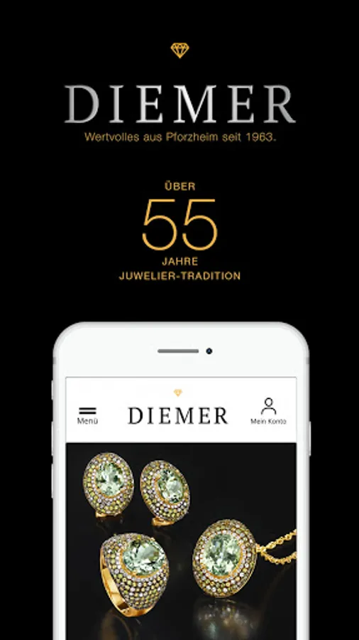 The DIEMER jewelry app offers you an exclusive selection of jewelry and watches, such as king's chains, diamond rings, gold rings or a diverse range of colored stone jewelry. With our free DIEMER jewelry app, you are just a few clicks away from your new favorite piece of jewelry. Shop whenever and wherever you want and stay informed about jewelry highlights, trends and promotions at DIEMER. With this jewelry app you can now buy jewelry online anywhere and anytime.