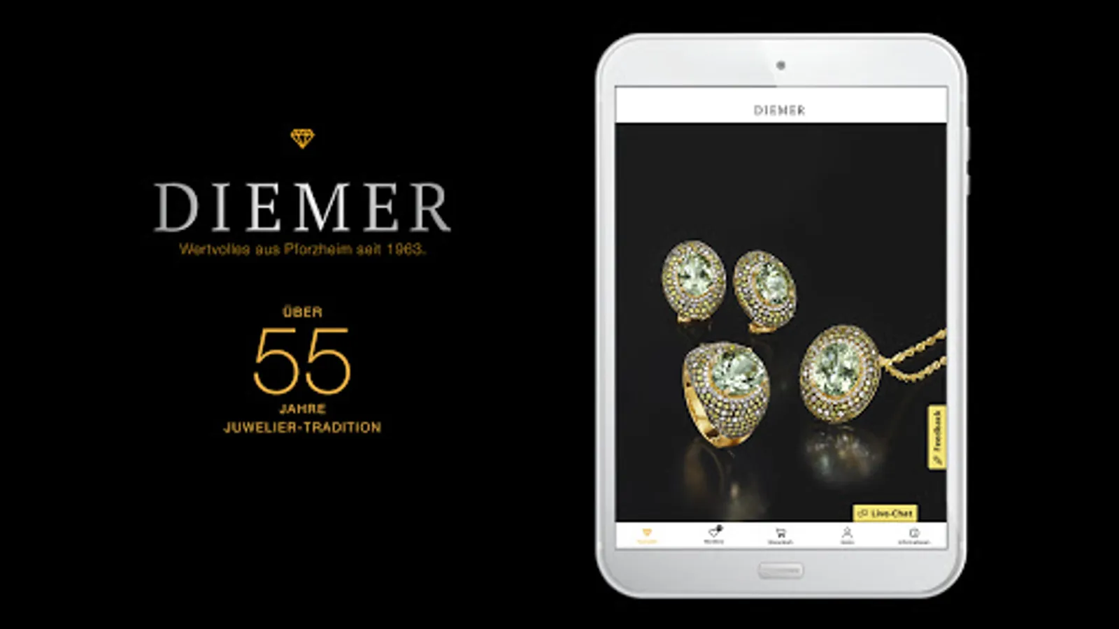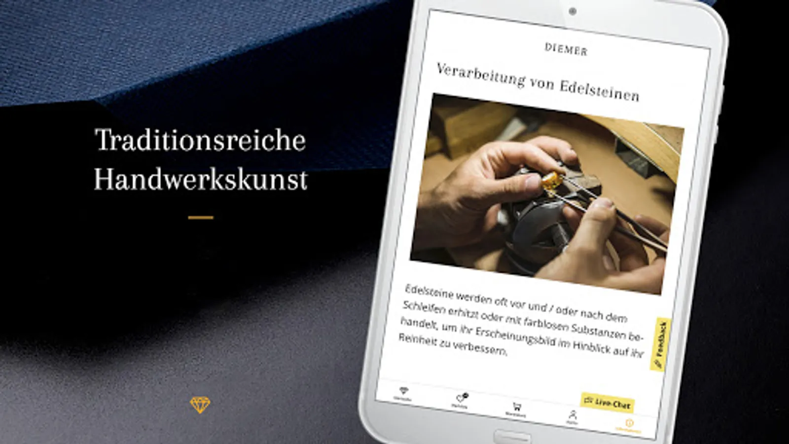 In our jewelry app you will not only find classic and modern jewelry collections but also a wide range of our exclusive own brands such as DIEMER Perle, DIEMER Gold and DIEMER Solitaire. DIEMER has the highest standards along the entire value chain. No wishes remain unfulfilled - because you have the opportunity to have individual pieces of jewelry or wedding rings made. You will find a diverse and clear range of products at an excellent price-performance ratio online, in the catalog or on site in our jewelry store in the gold city of Pforzheim. Our service is characterized by excellent advice with the highest customer appreciation.