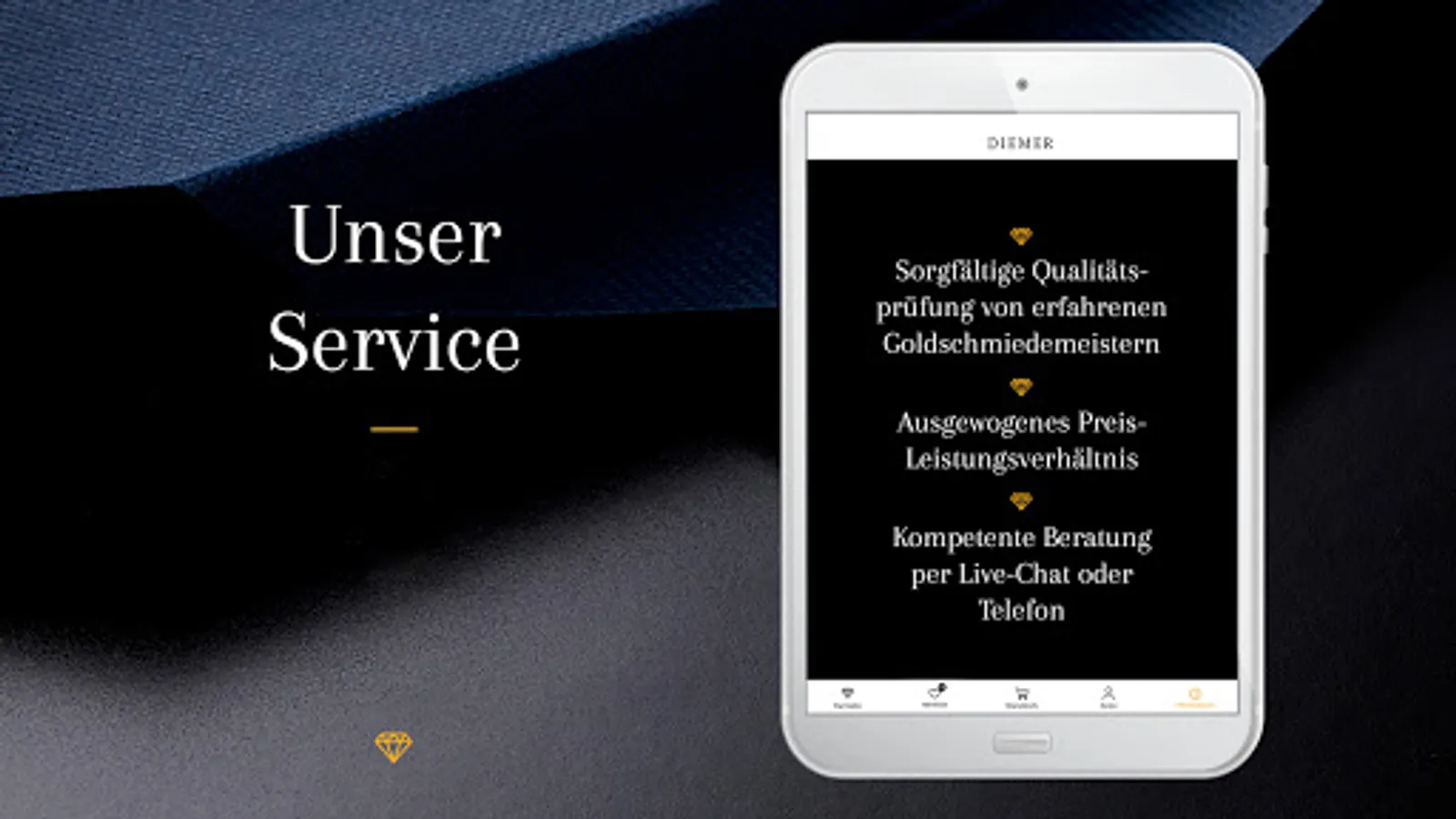 With the DIEMER shopping app you have many advantages and functions: Optimized product search, high-resolution images and an enlargement with zoom function. In our app you can stay logged in, save items on your watch list, call up all important product information, view your orders and much more. We also advise you on all aspects of cleaning and caring for your jewelry.