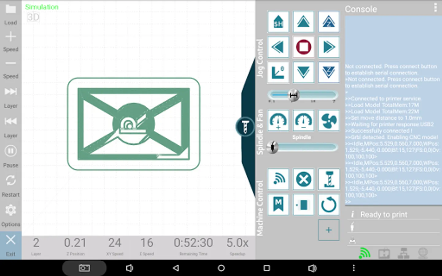 GCodeCNC enables you to use any Android tablet or phone as a touch screen for your CNC machine (GRBL, Marlin) and to run CNC jobs without the need for having a PC running. With the intuitive UI interface you can always see what the status is (e.g. remaining time) and modify parameters (speed, etc.). Your Android device can also act as a web server to allow you to start a job remotely or watch the job status.