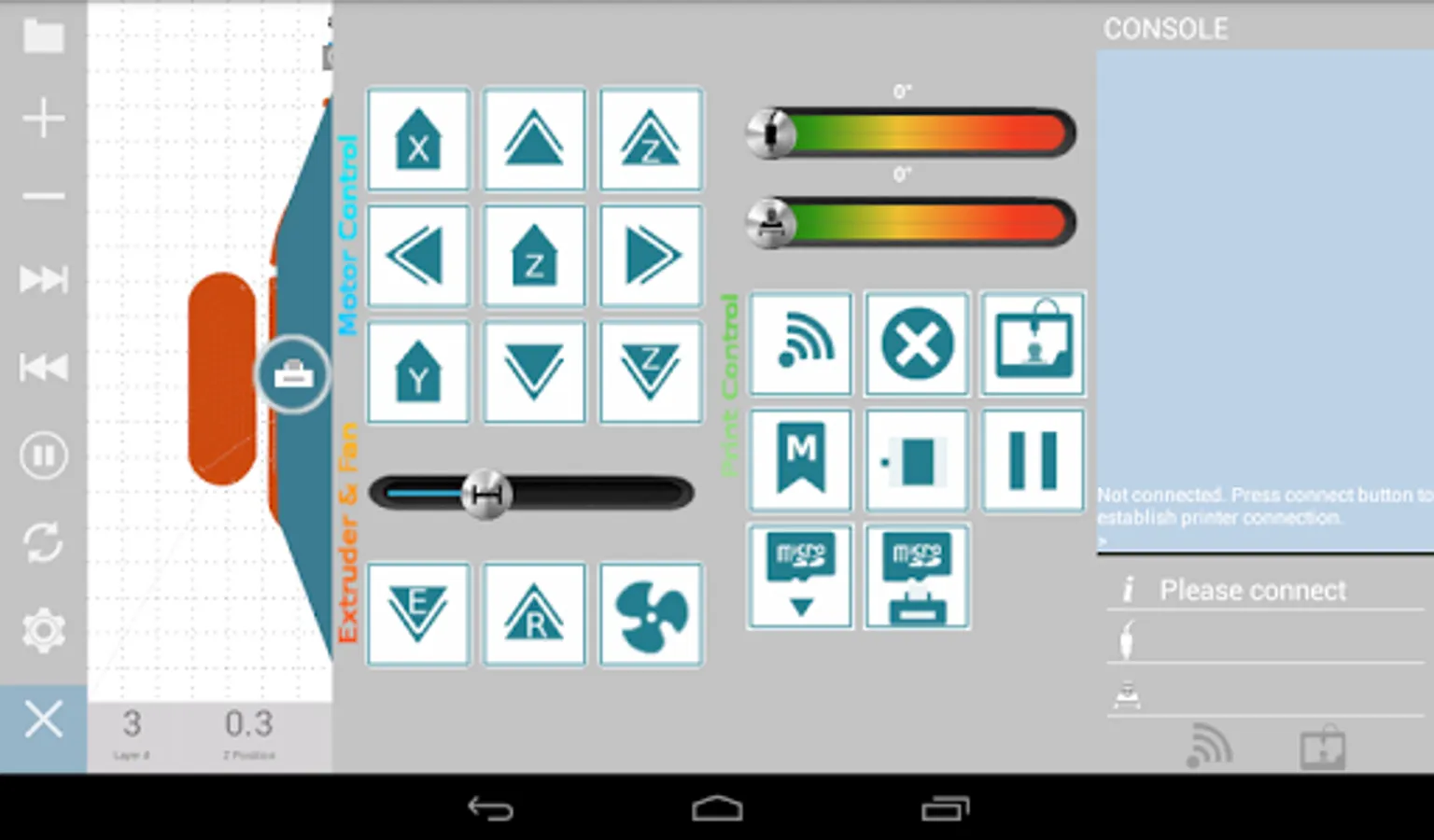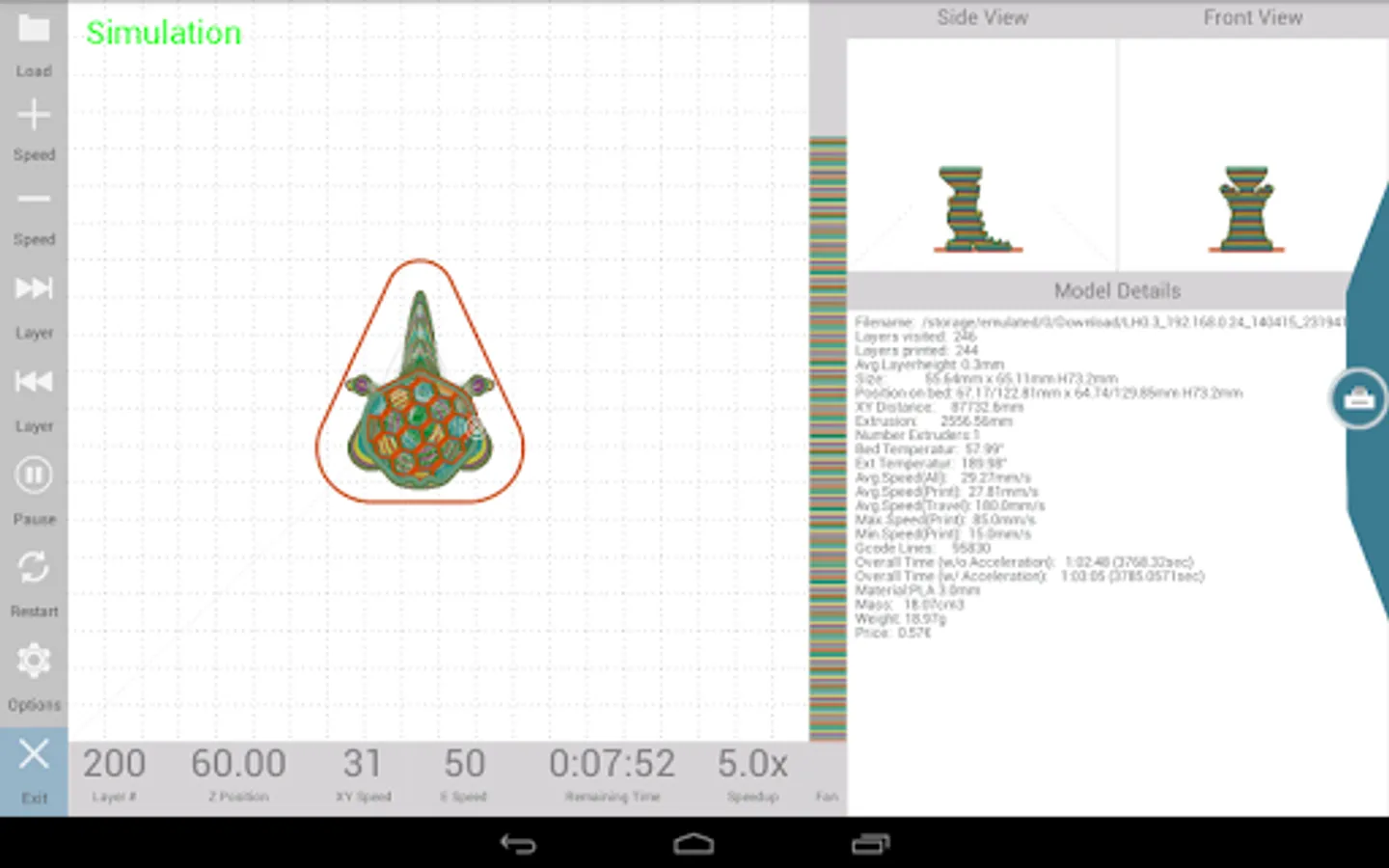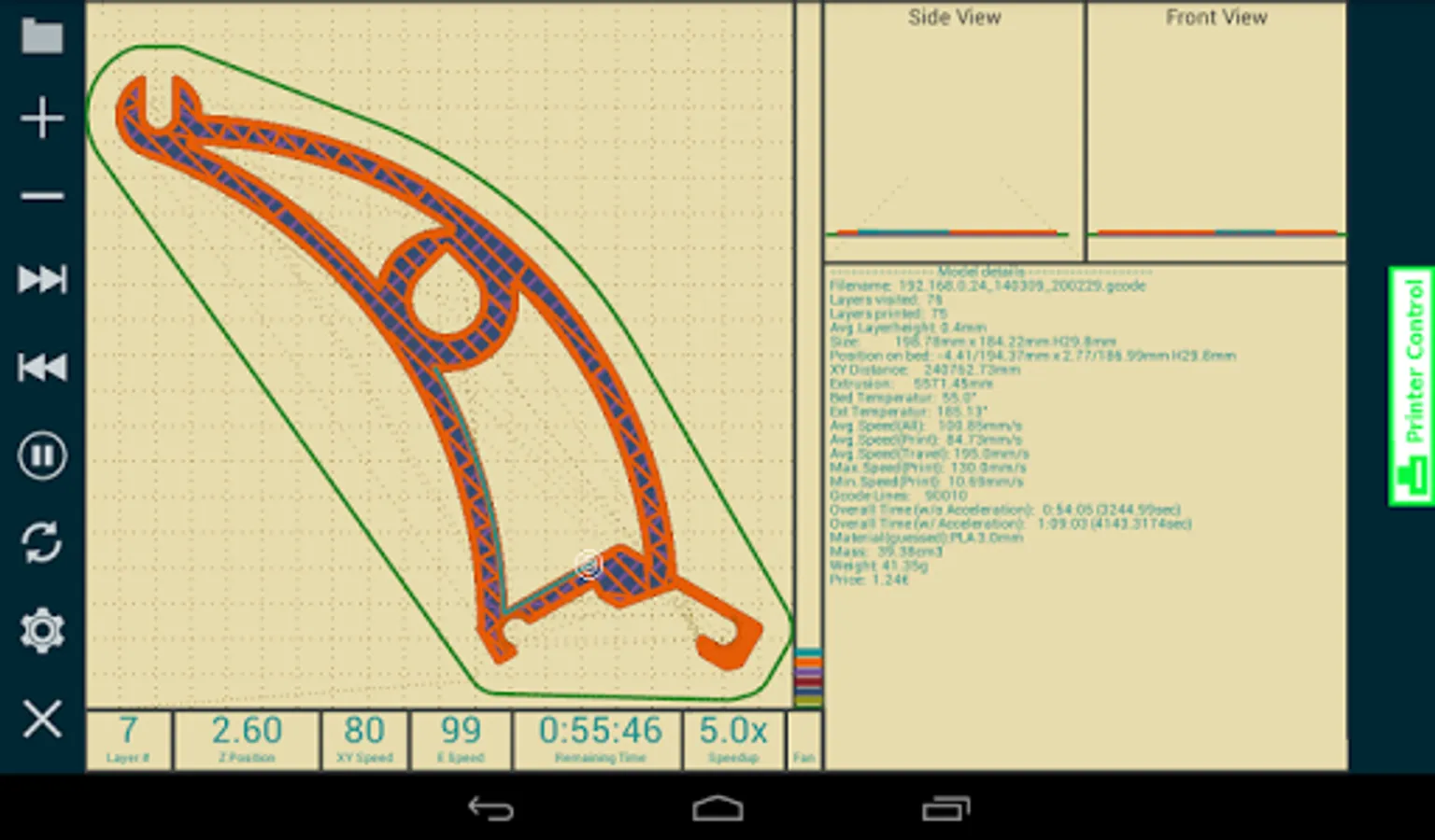 GCodeSimulator visualizes 3D printing gcodes and simulates the 3D print.It shows how your print will look like, allowing you to check your print upfront, making it easier to spot errors and fix them instead of wasting filament. In addition, GCodeSimulator can connect to many 3D printers using USB-OTG cable (or Bluetooth) to control the printer. The printer control panel provides the most important printer controls (e.g. XYZ Movement) for manual operations. This enables you to use any Android tablet or phone as a touch screen for your 3D printer.