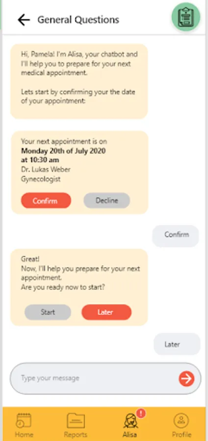 You will be supported by the app before appointment with your doctor and asked about your medical history as well as current symptoms via an intelligent chatbot. Between the doctor's appointments, you will be accompanied through everyday life with the chatbot and further information in order to actively shape the course of your recovery, as well as practice independent disease management overcoming any language barriers with health professionals.