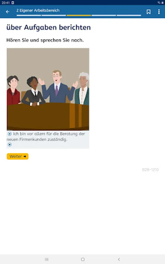 You can learn German for free at B2 level. B2-Beruf is the mobile version of the B2 Business German Course (B2-Deutschkurs Beruf) at https://vhs-lernportal.de/deutsch. The app allows you to use all the functions of the B2 German Course offline on your smartphone.