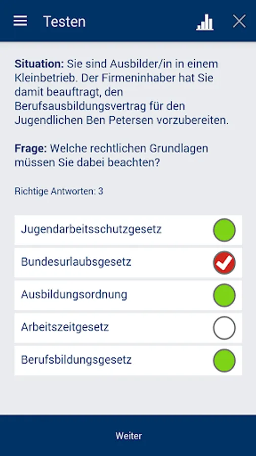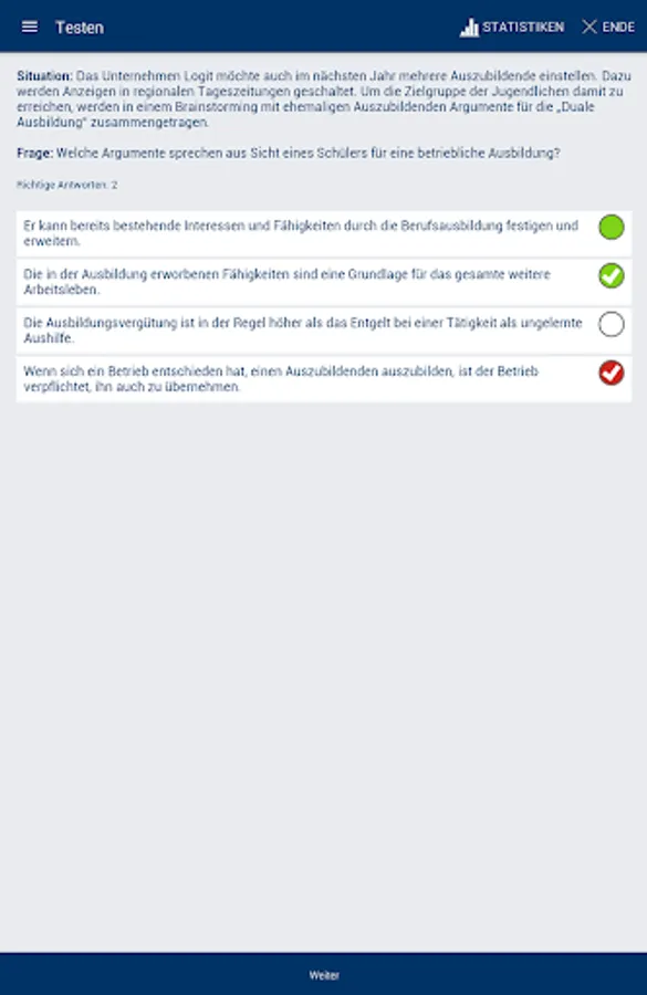 Choose between the training or test mode: In the training mode, only the correct answers are offered according to the flash card principle. In the test mode, you will receive an evaluation with a display of the correct and incorrect answers immediately after you have attempted a solution. At the end of the test, you will be asked if you want to repeat the incorrectly answered questions.