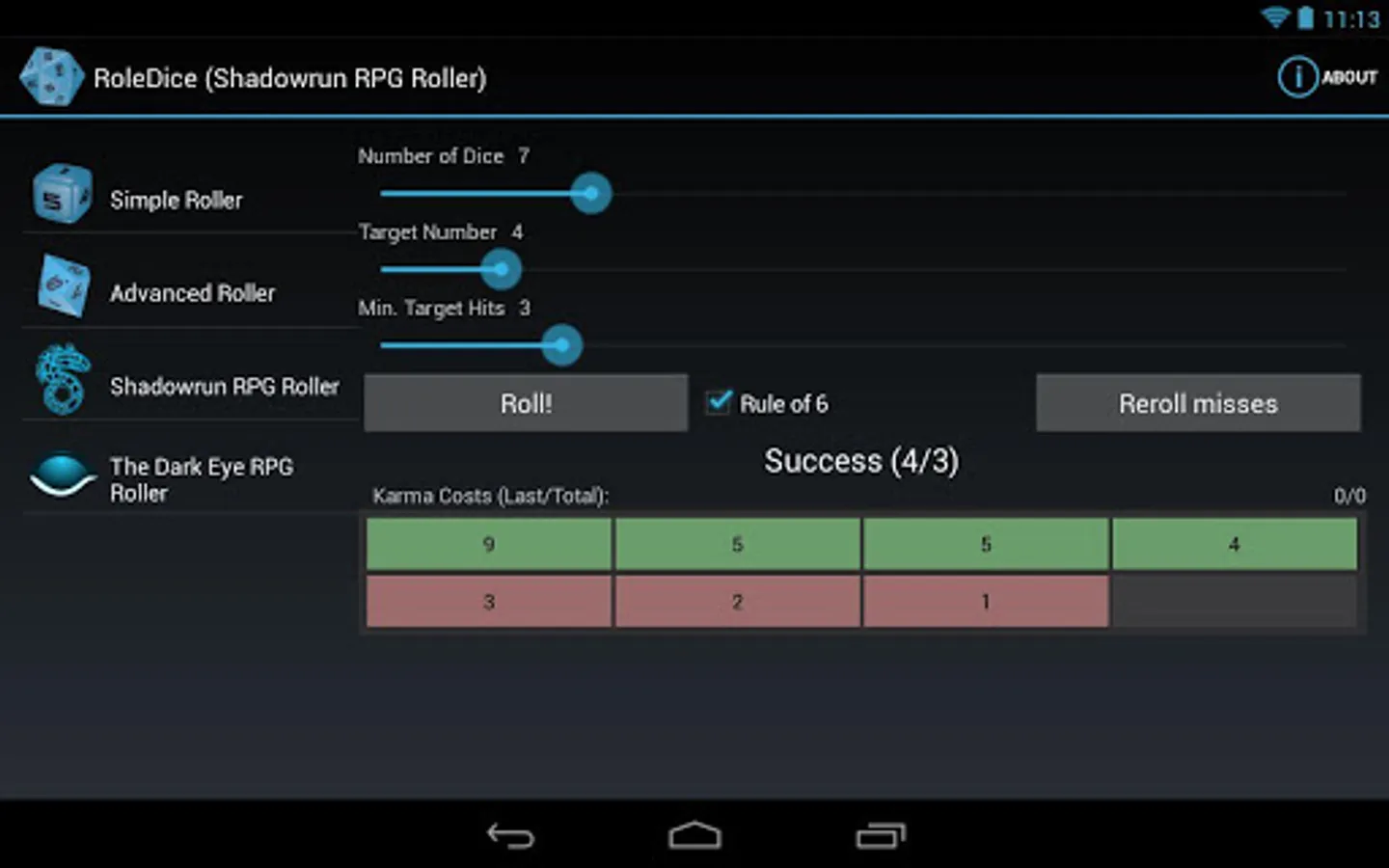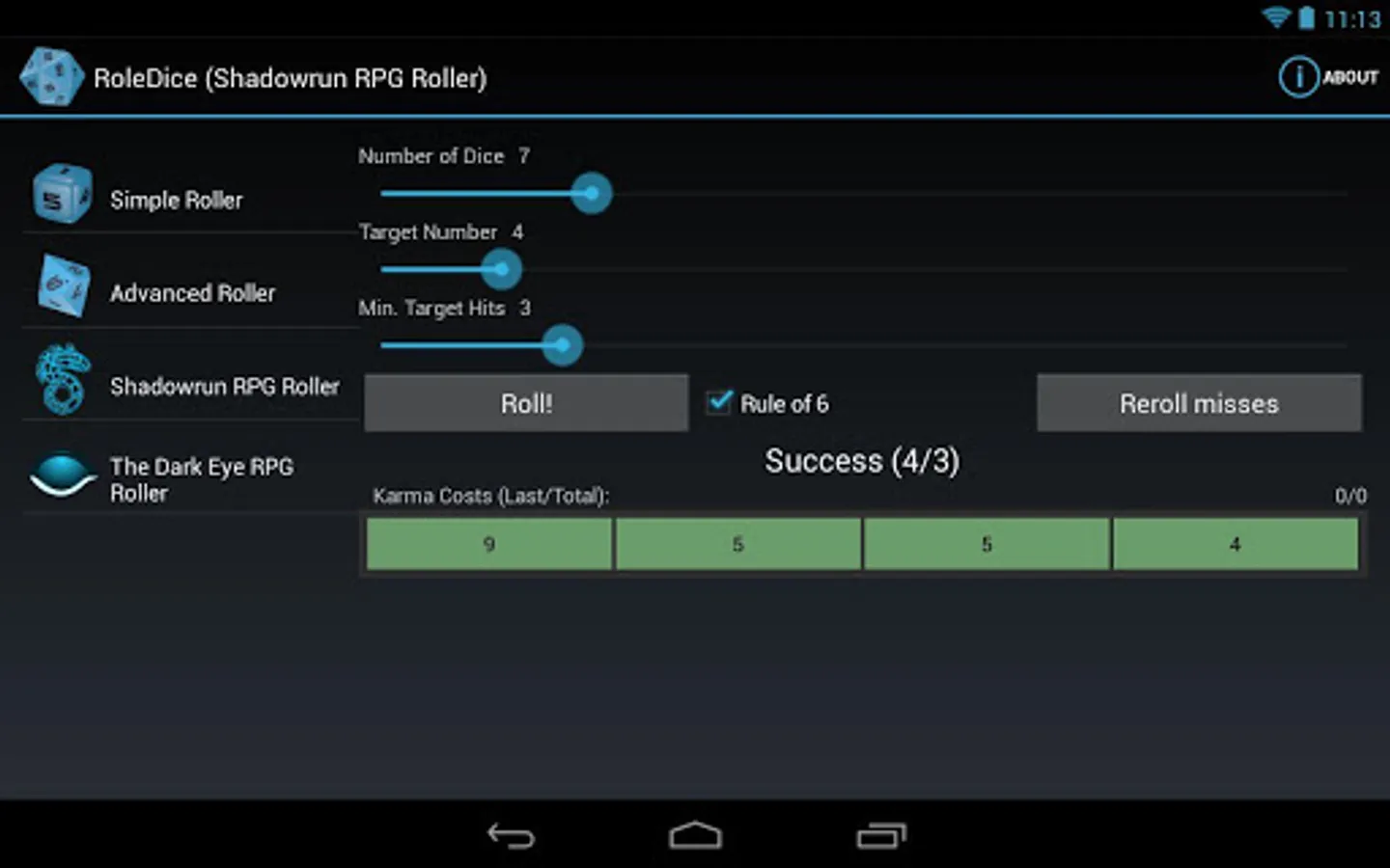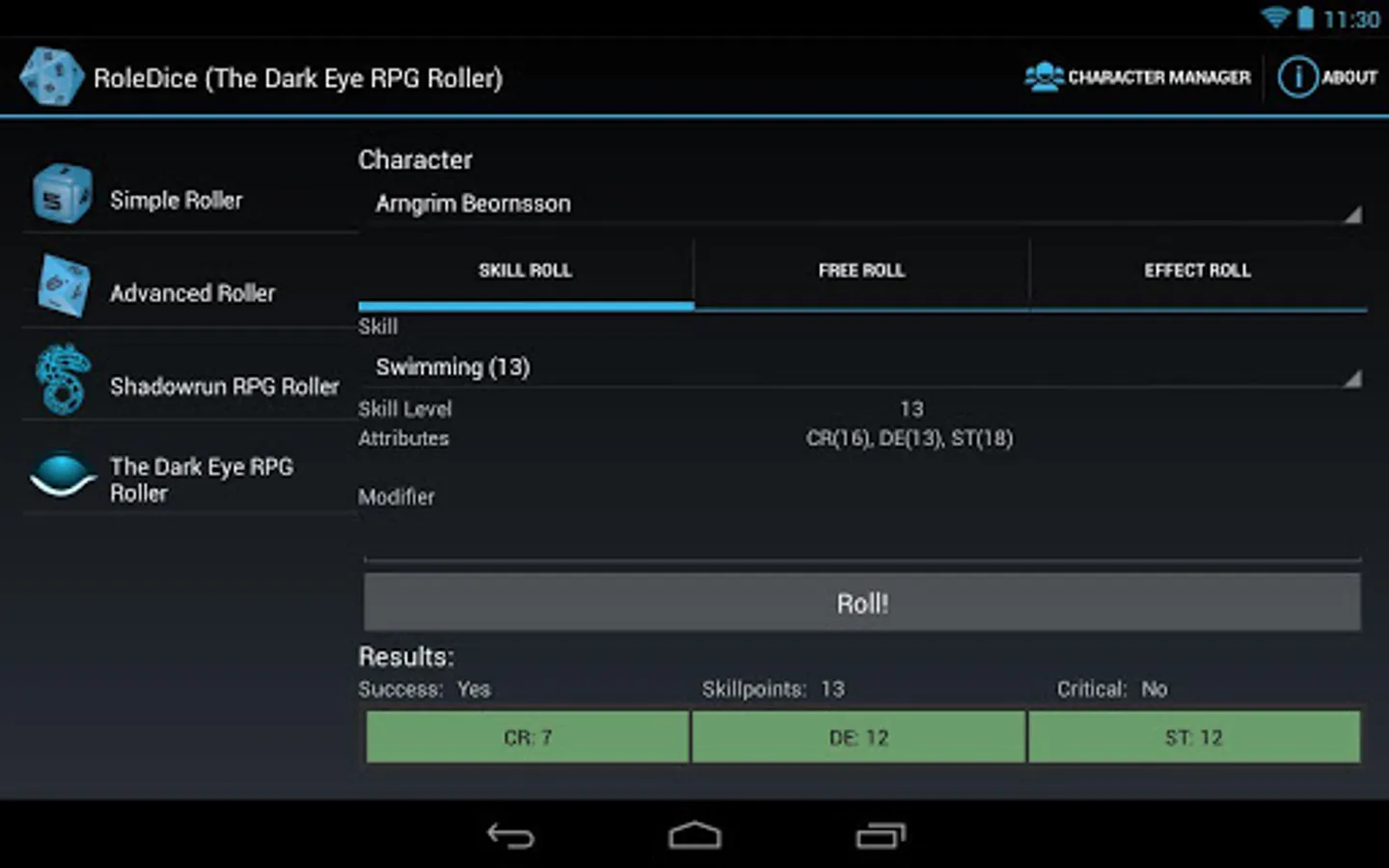 The main focus of RoleDice is role-playing games, hence the name. Therefore, it also contains rpg-specific roller-modules, e.g. for Shadowrun and The Dark Eye (TDE/DSA). These RPG-specific modules make rolling during a game-session easy. The TDE-module, for example provides a character-manager, in which you can add your character with his/her attributes and skills, and then, during a session, simply select a skill and hit the "roll"-button - the app automatically uses the correct attributes you defined when you added the skill.