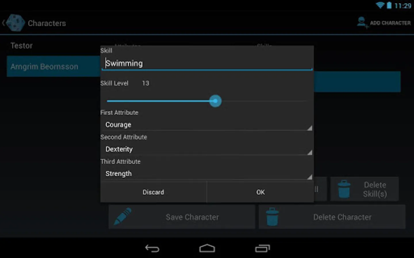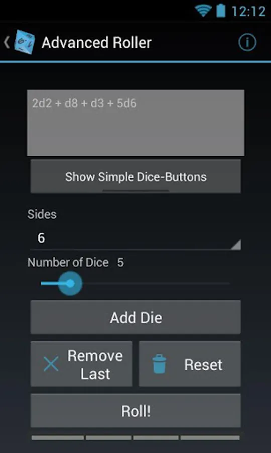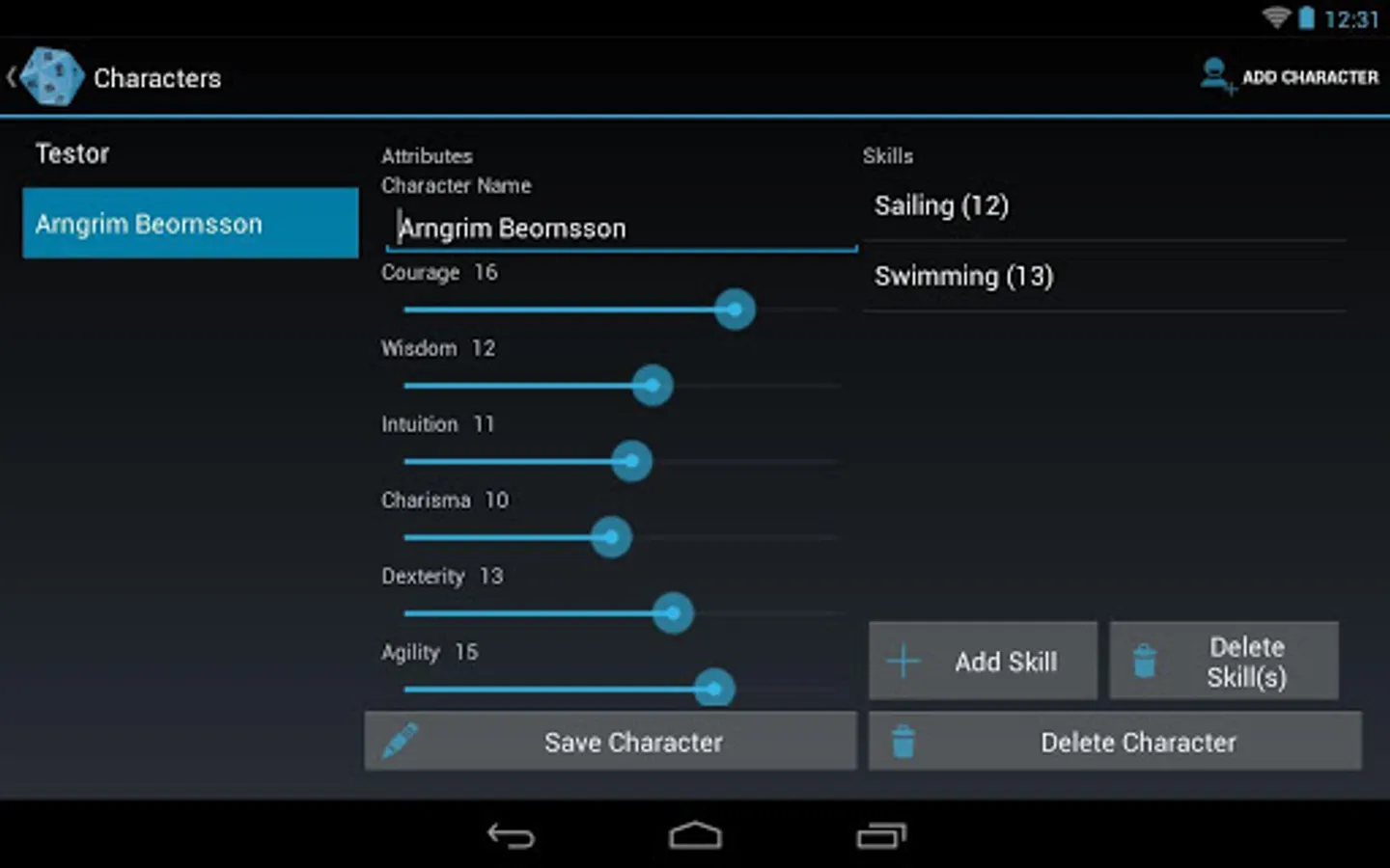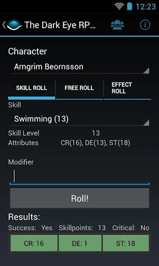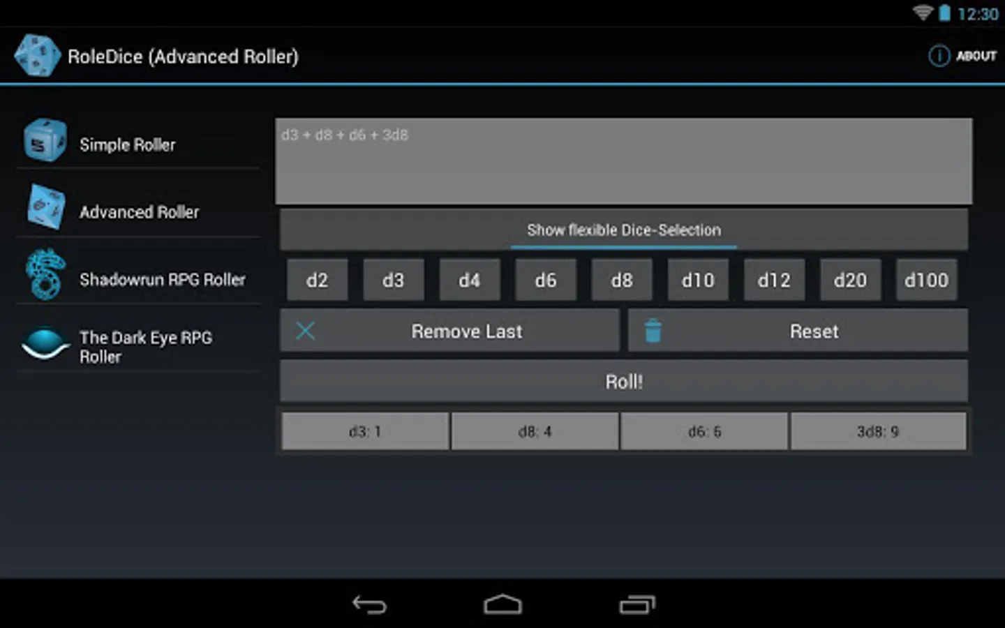 The main focus of RoleDice is role-playing games, hence the name. Therefore, it also contains rpg-specific roller-modules, e.g. for Shadowrun and The Dark Eye (TDE/DSA). These RPG-specific modules make rolling during a game-session easy. The TDE-module, for example provides a character-manager, in which you can add your character with his/her attributes and skills, and then, during a session, simply select a skill and hit the "roll"-button - the app automatically uses the correct attributes you defined when you added the skill.