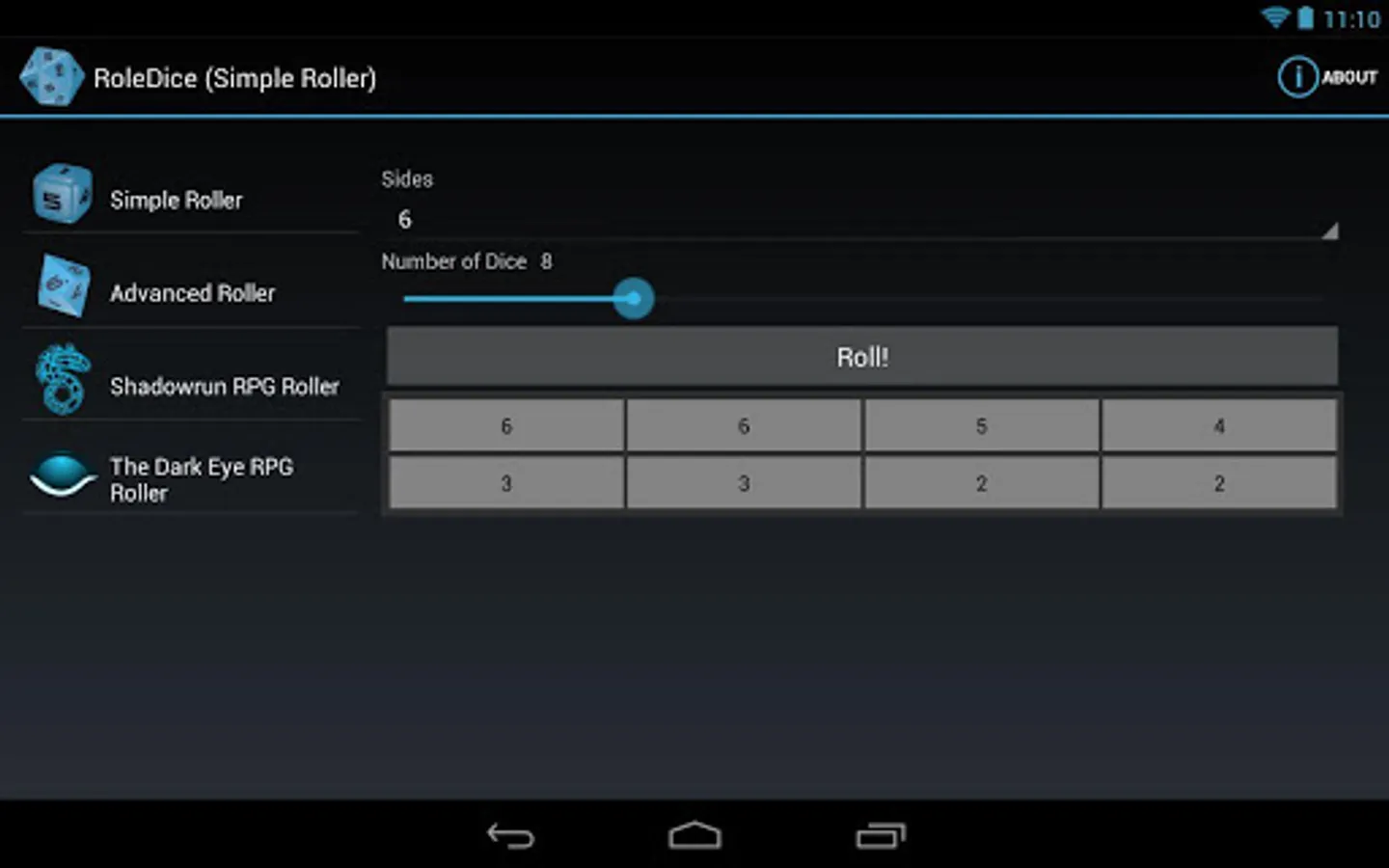RoleDice is a virtual dice-roller. It's an app optimized to work on android tablets and phones alike, for rolling one or more dice.