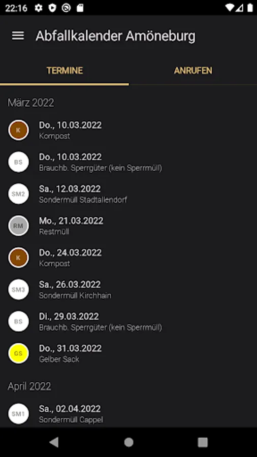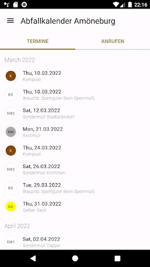 The dates are created manually from the PDF version at https://www.amoeneburg.de/kalender/de/stadt/-/2/calendar_show publicly available waste calendar of the city of Amöneburg has been incorporated into the app. If you discover any discrepancies when comparing the collection calendar for your collection area, please let me know so that I can correct them!