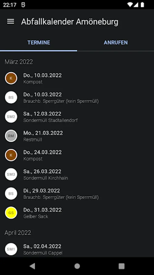 The app displays a list of all upcoming collection dates for your place of residence and makes it possible to dial important phone numbers relating to waste disposal directly from the app. The app works without an internet connection and does not collect any personal data!