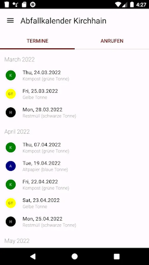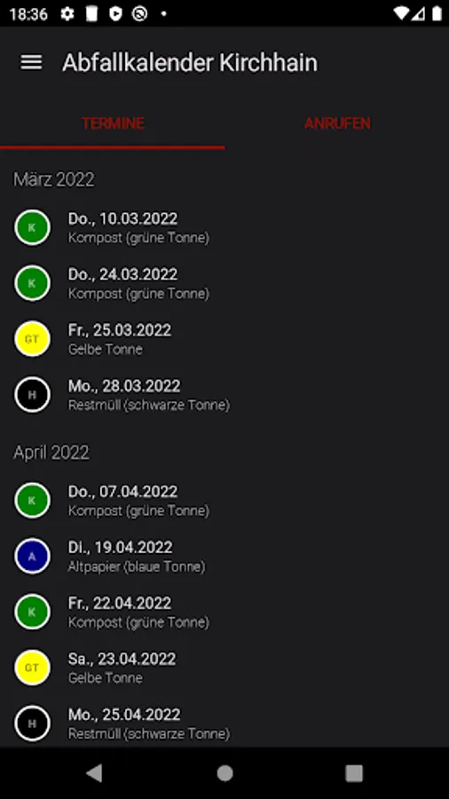 The dates are entered manually from the PDF version of the publicly available waste calendar of the city of Kirchhain in the app. If you spot any discrepancies when comparing it to the collection calendar for your pickup area, please let me know so I can correct it!