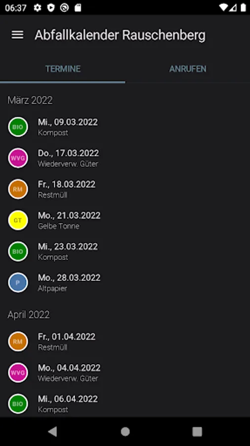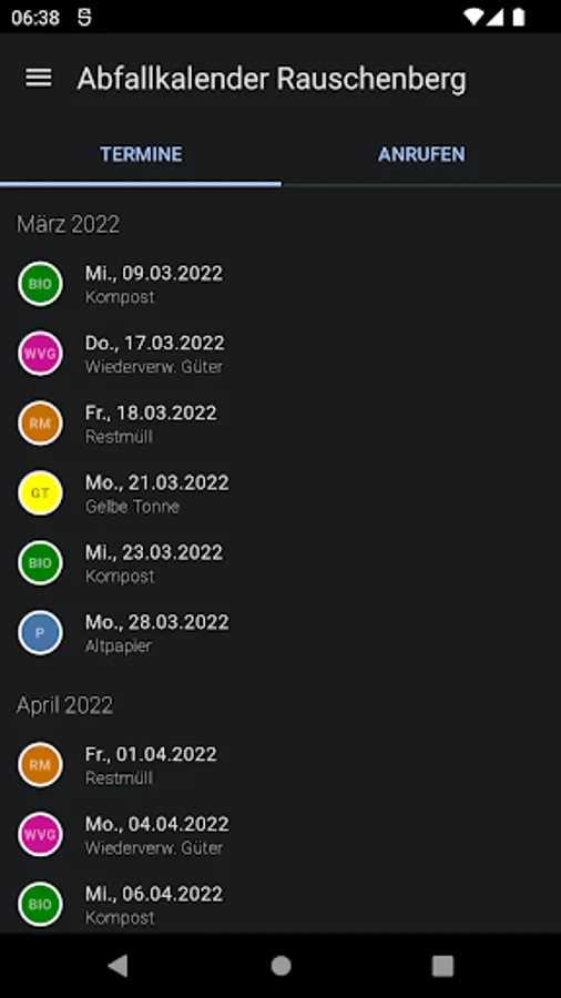 The dates are manually transferred to the app from the PDF version of the publicly available waste calendar from the city of Rauschenberg. If you spot any discrepancies when comparing it to the collection calendar for your pickup area, please let me know so I can correct it!