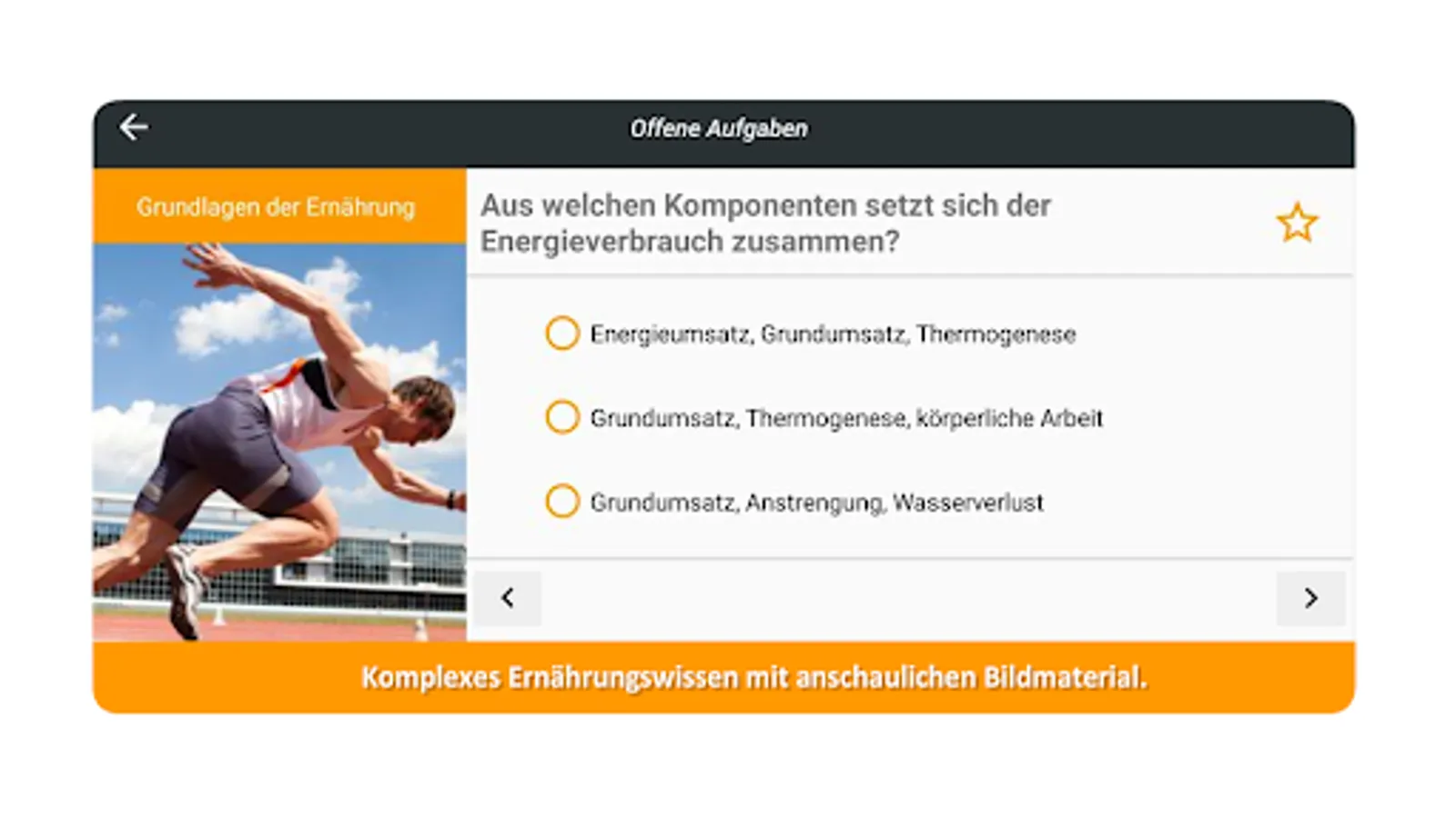 With this app, you can expand your nutritional knowledge and immediately bring yourself up to date. Optionally, you can prepare yourself for the test for the "Qualified Nutrition Coach B license"!