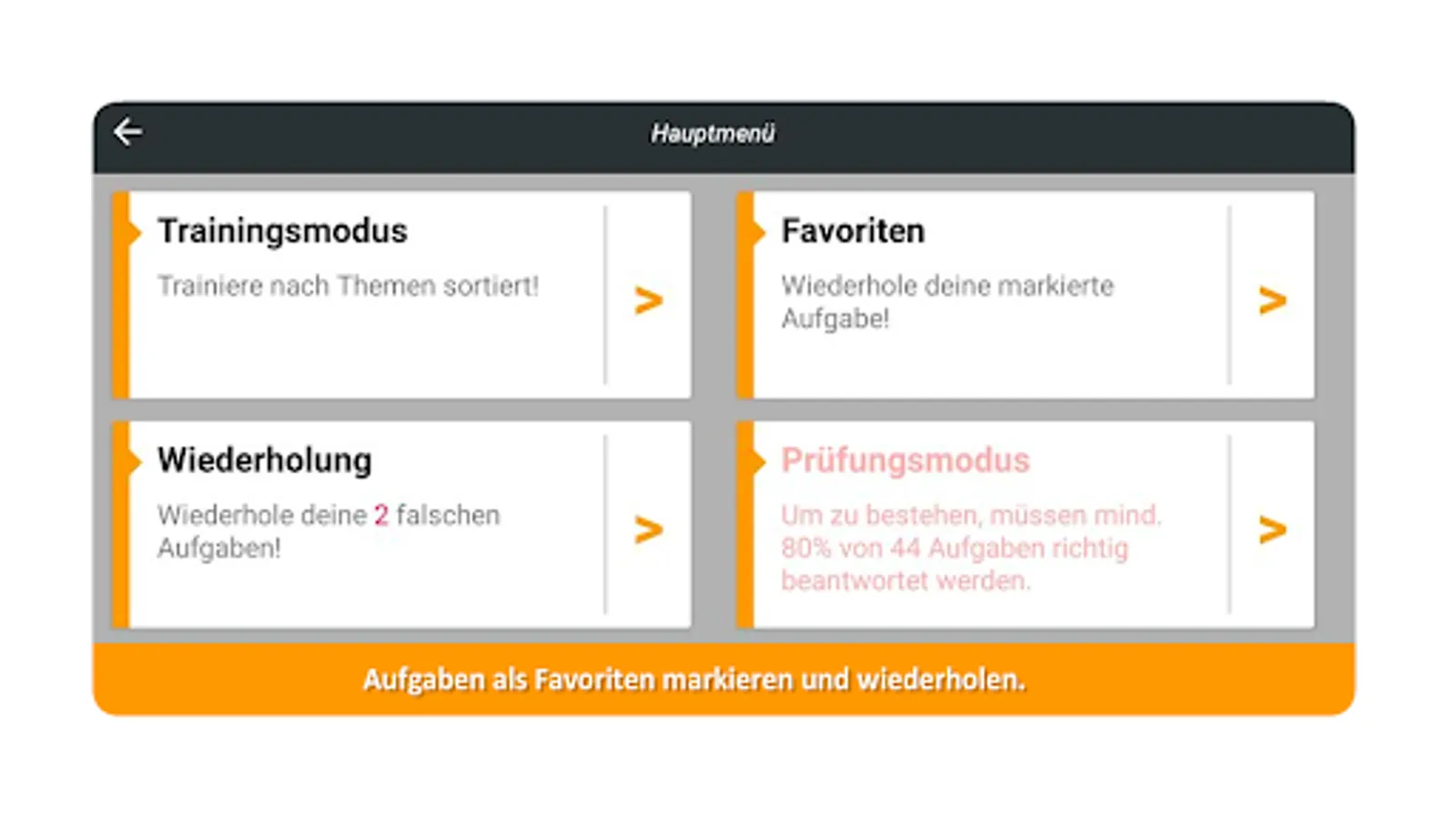 Learn with original questions and without restrictions. After passing the exam mode, you can register directly for the theoretical exam.