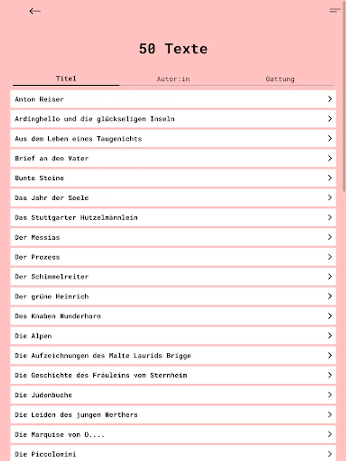 Johann Wolfgang Goethe's novel The Sorrows of Young Werther or Else Lasker-Schüler's collection of poems My blue piano? 50 canonical narratives, novels, volumes of poetry and plays in German-language literature from the 18th to the 20th century are the focus of literary reading. Anyone who reads them in the app can use the advantages of digital reading (e.g. search in the full texts and share their own reading tracks with others) and at the same time become part of a research project in action: reading literature collects and visualizes reading data so that we can learn more about our reading habits can. When and how, for how long, how often and why do we read? Do we belong to the full readers, fortune-tellers, title dreamers, sentence collectors or reading trail hunters?