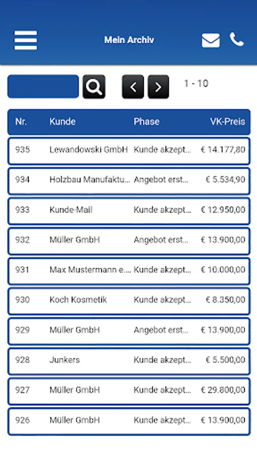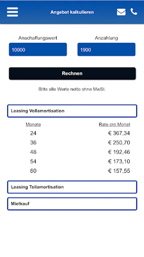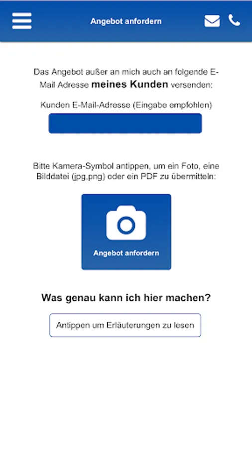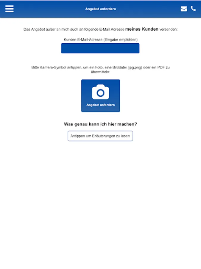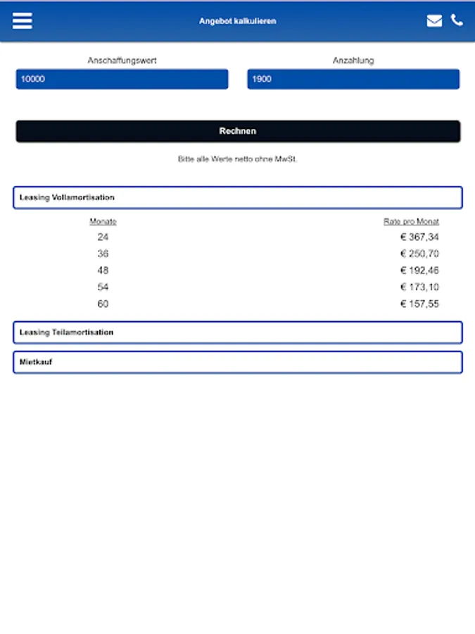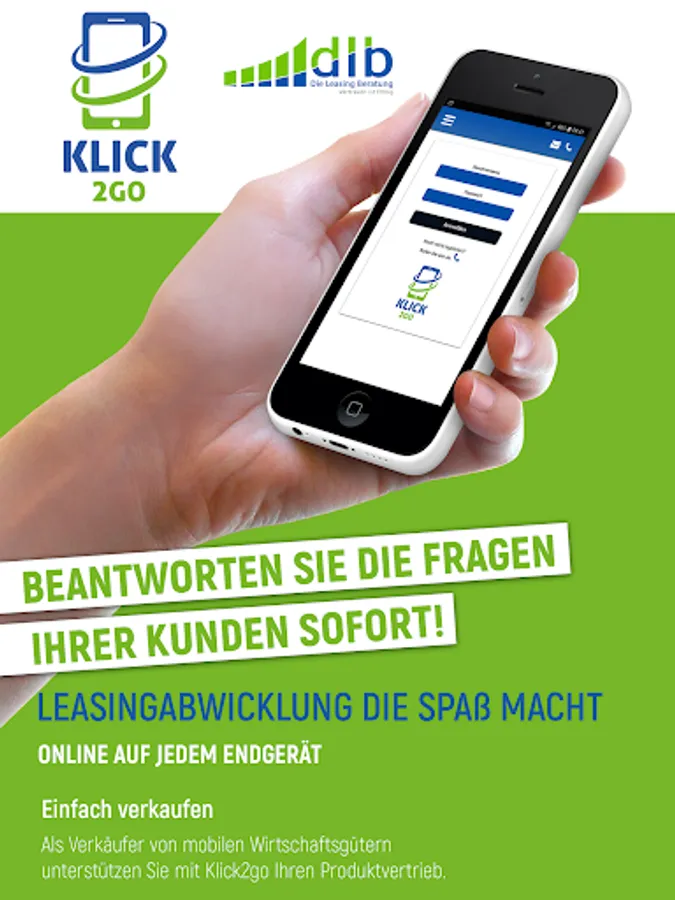 Klick2Go is THE simple, mobile solution for product distribution. In addition to a rate calculator, the app also includes a live archive of current inquiries, with which the respective status of the lease request can be read. With Klick2Go, you always have your leasing solution with you and can respond to the needs of your customers. Current prices and contact persons are immediately available, with Klick2Go you can trigger written offers without you really having work. A simple photo of your project is enough - the rest is fully automatic and safe.