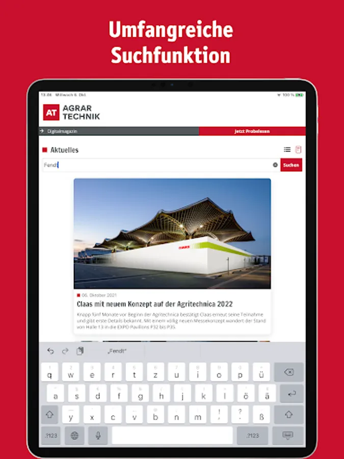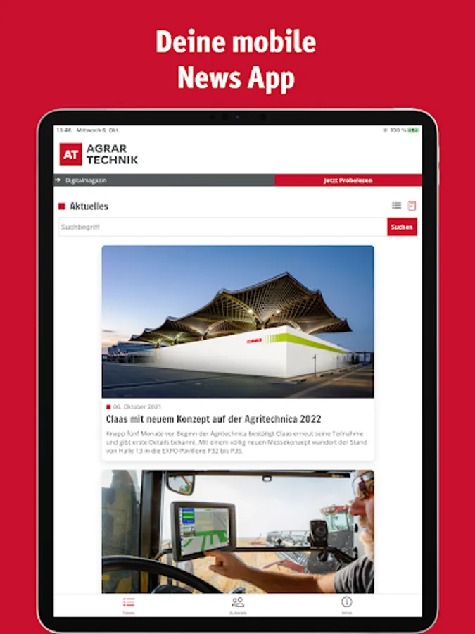 Always stay up to date on what's going on in the agricultural & construction machinery industry. With the AGRARTECHNIK news app you always have the latest news on products, companies or personnel with you on your smartphone or tablet. Stay informed with us and stay on the road to success.